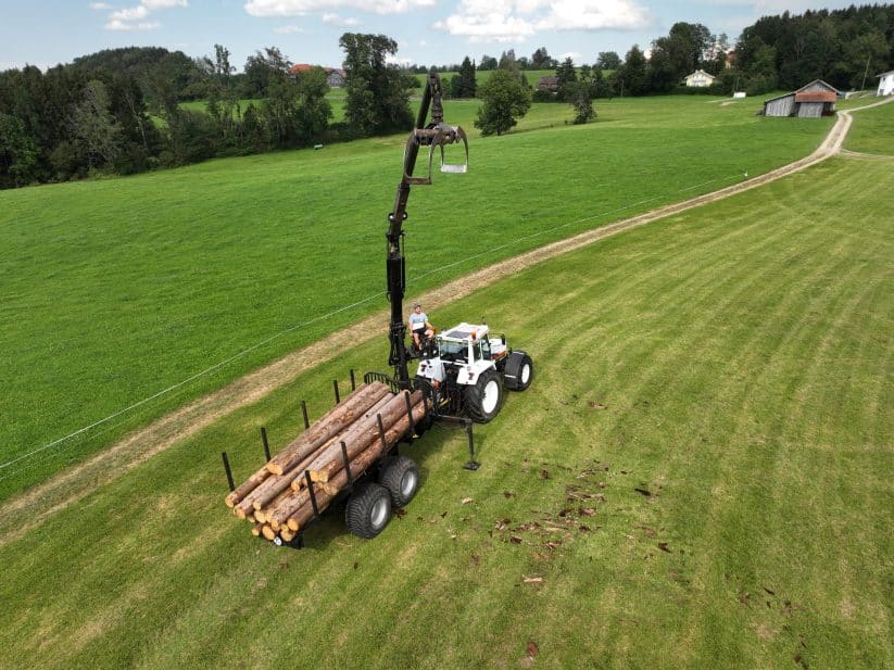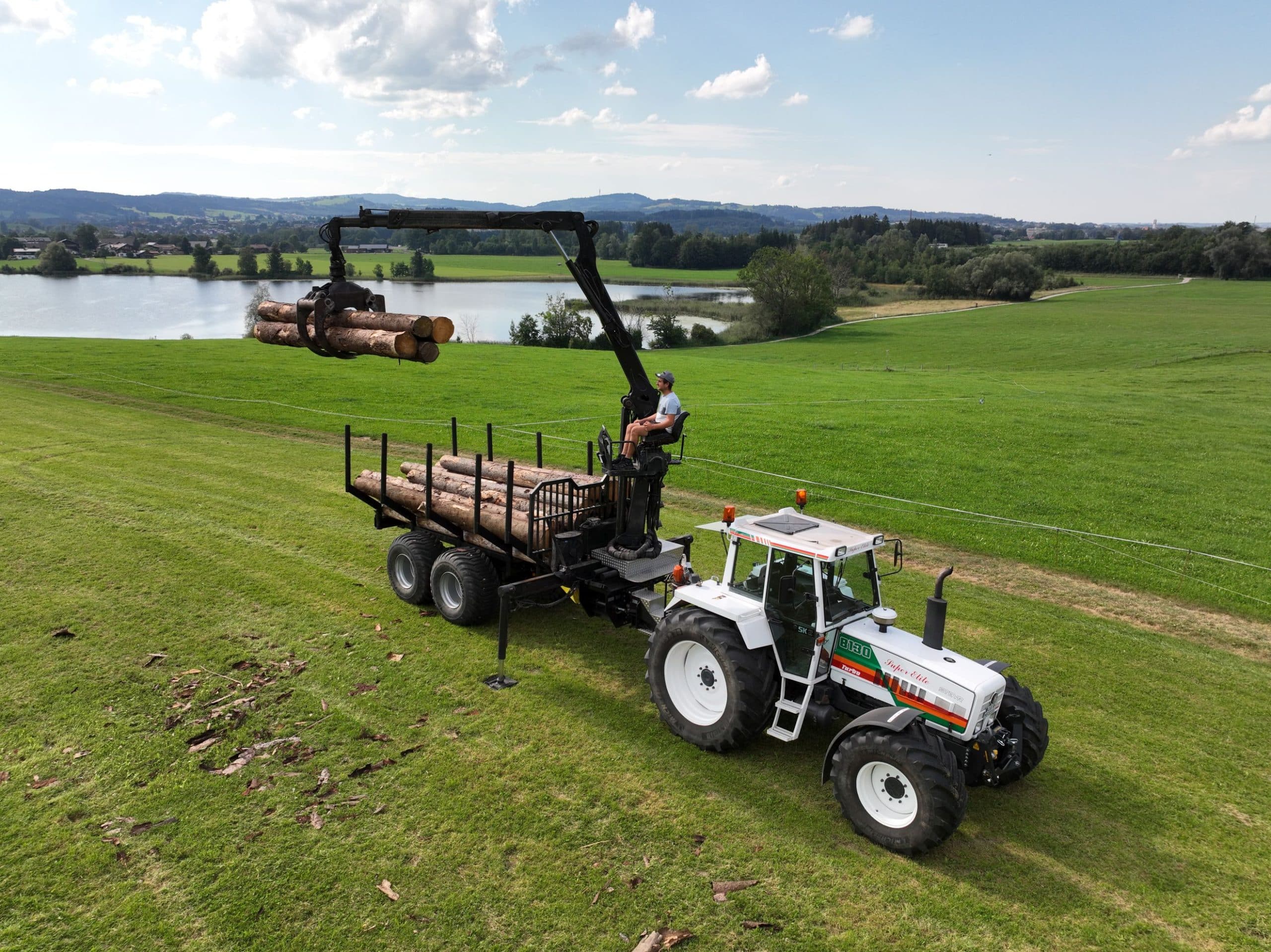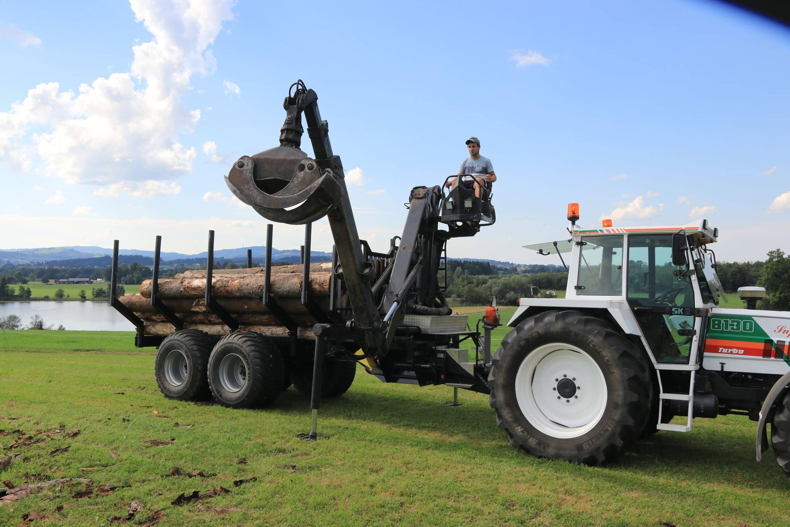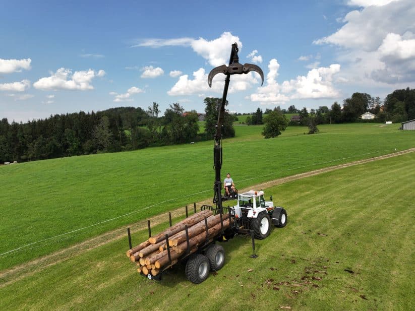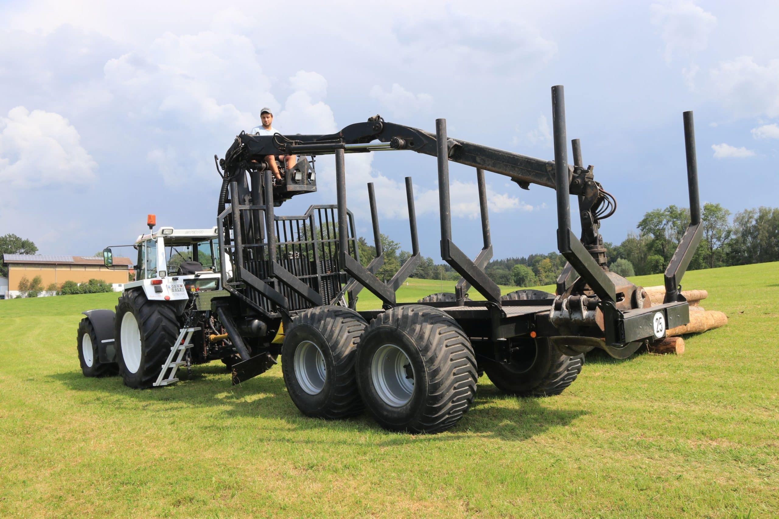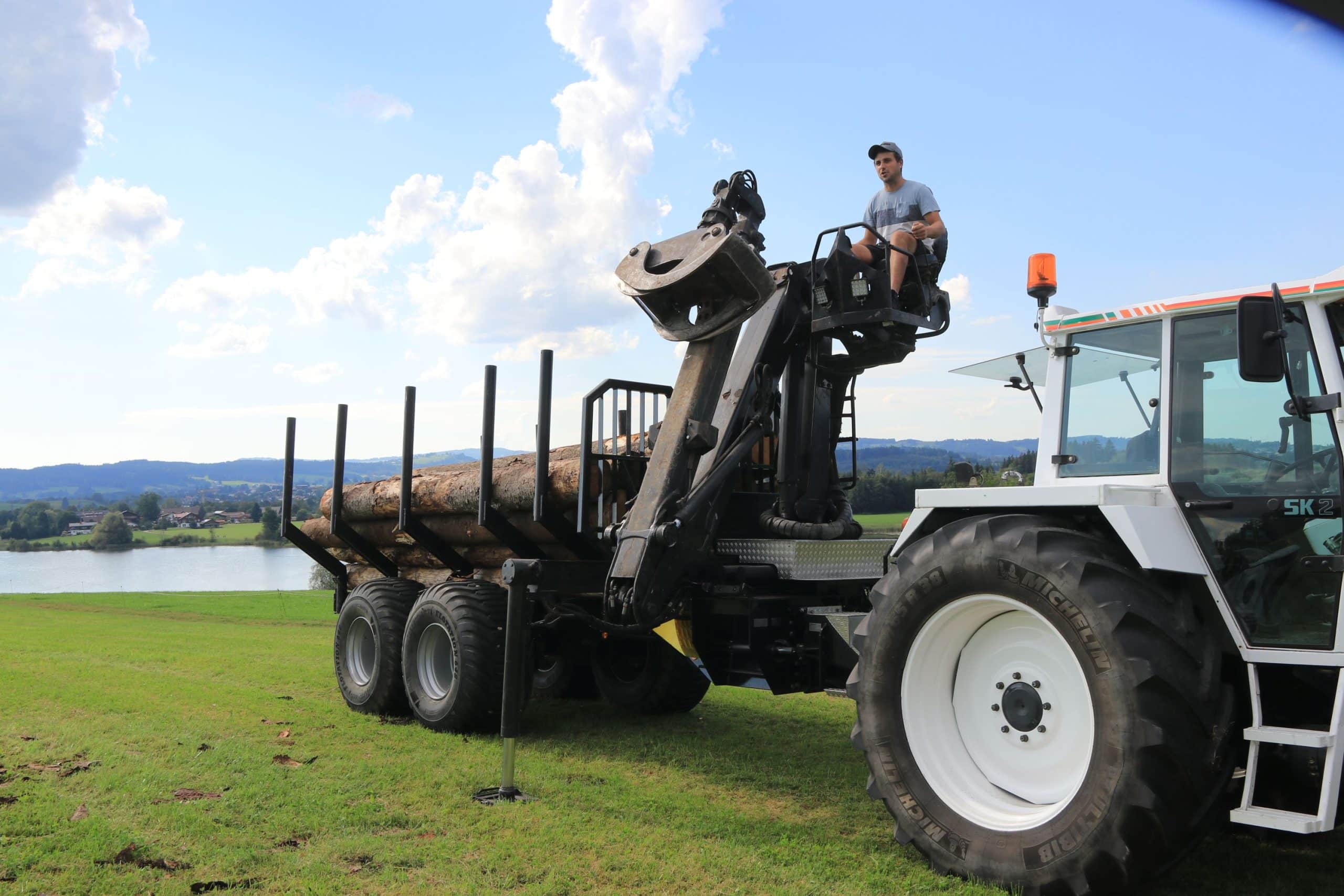 Der Bedarf an einem eigenen Rückewagen entstand bei Maximilian Bertele über Umwege. Der Landwirtschaftsmeister betreibt zusammen mit seinen Eltern und seiner Freundin einen Milchviehbetrieb in Sulzberg, Allgäu. 2020 hat die Familie ein kleines Nahwärmekraftwerk mit Hackschnitzelheizung gebaut, das neun Wohneinheiten versorgt. „Früher haben wir das Holz mit dem Frontlader auf den Kipper geladen und heim transportiert. Für größere Mengen war das aber unpraktisch“, blickt Bertele zurück. Dann folgte die Idee, sich einen Krananhänger zuzulegen. Doch gute gebrauchte Rückewagen in seiner Wunschausstattung gab es nicht.