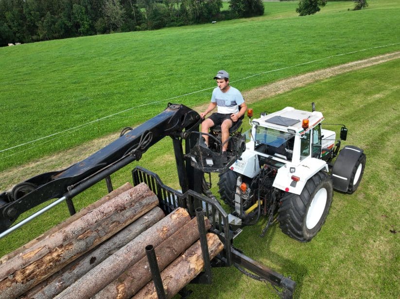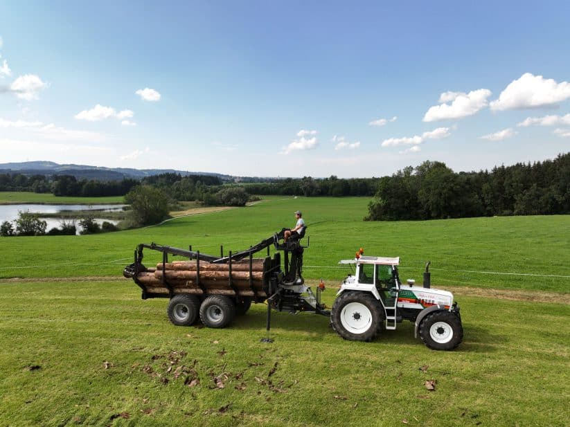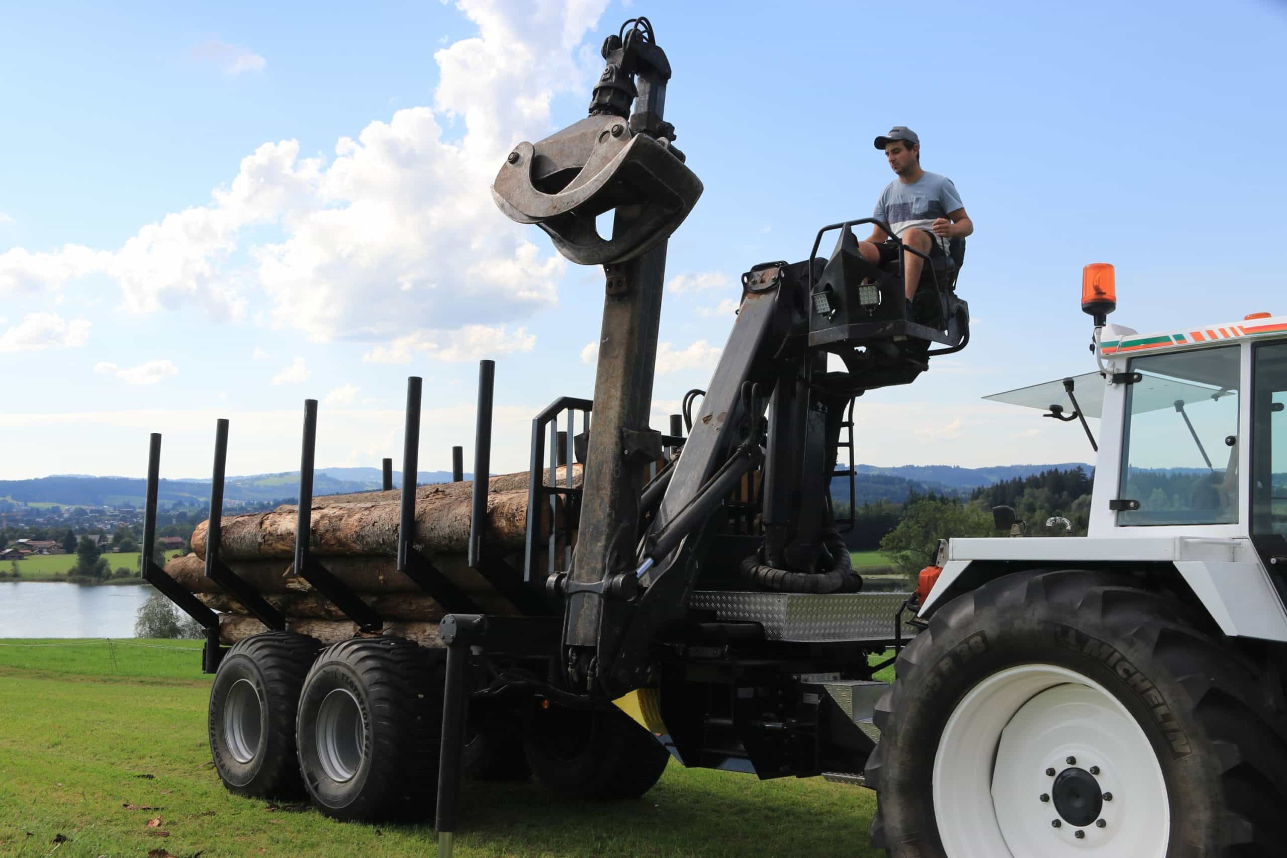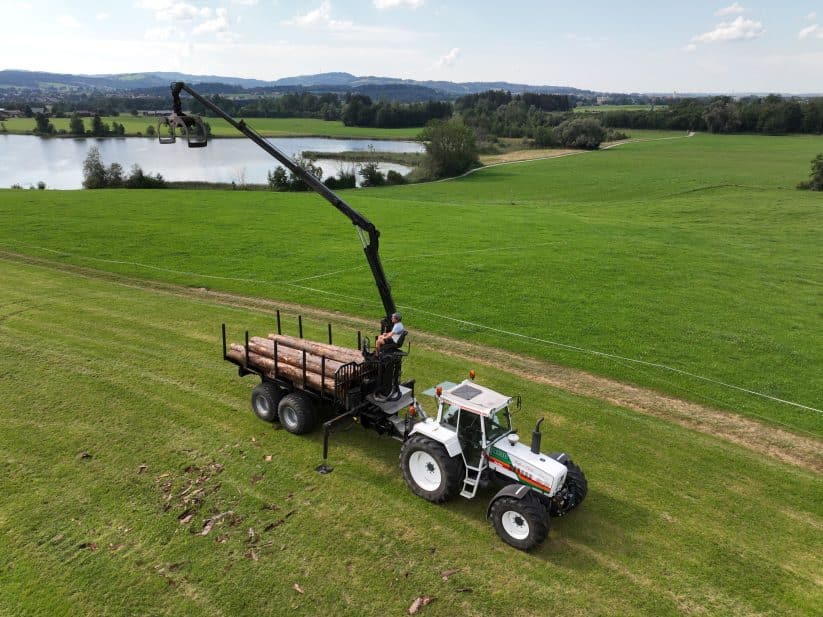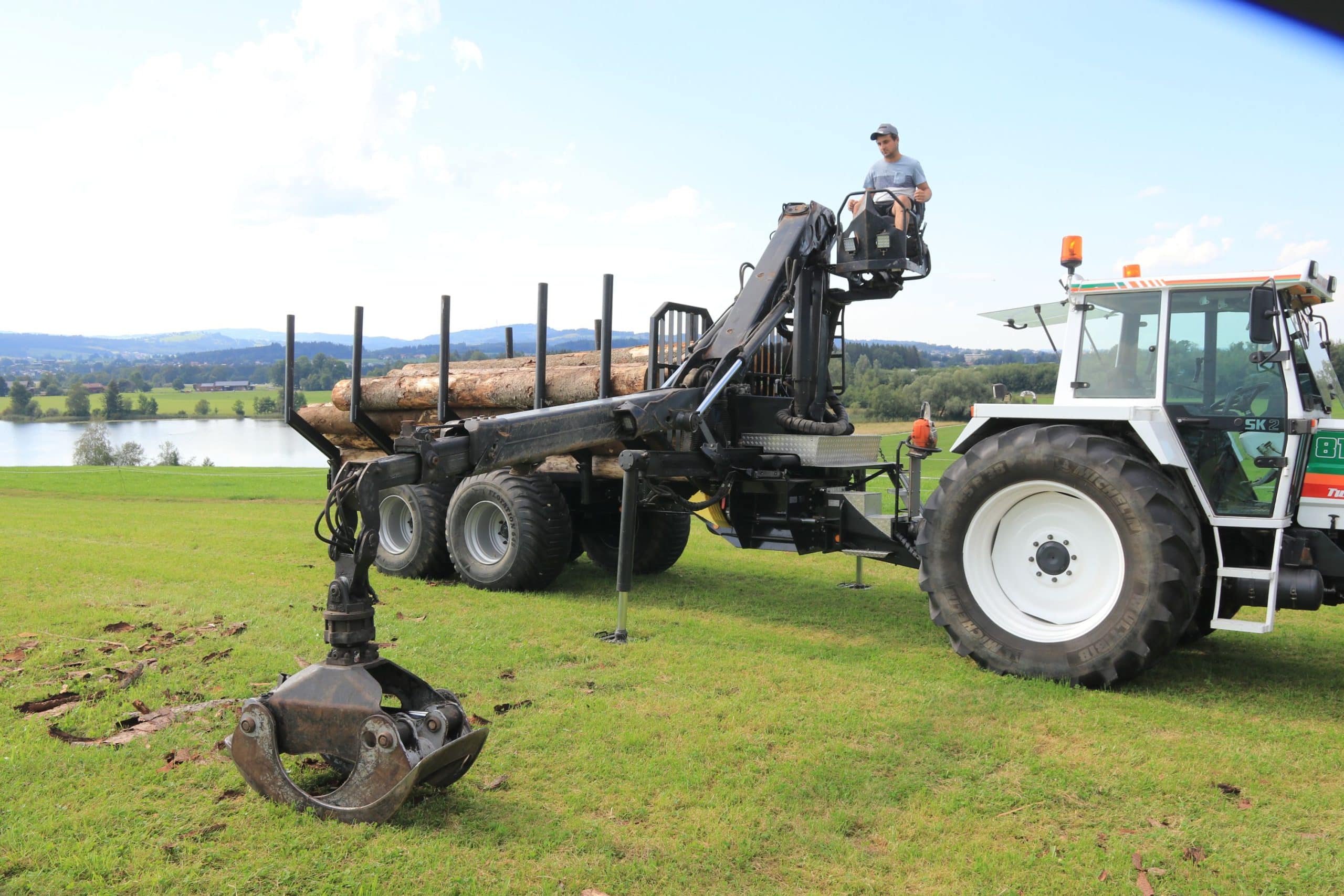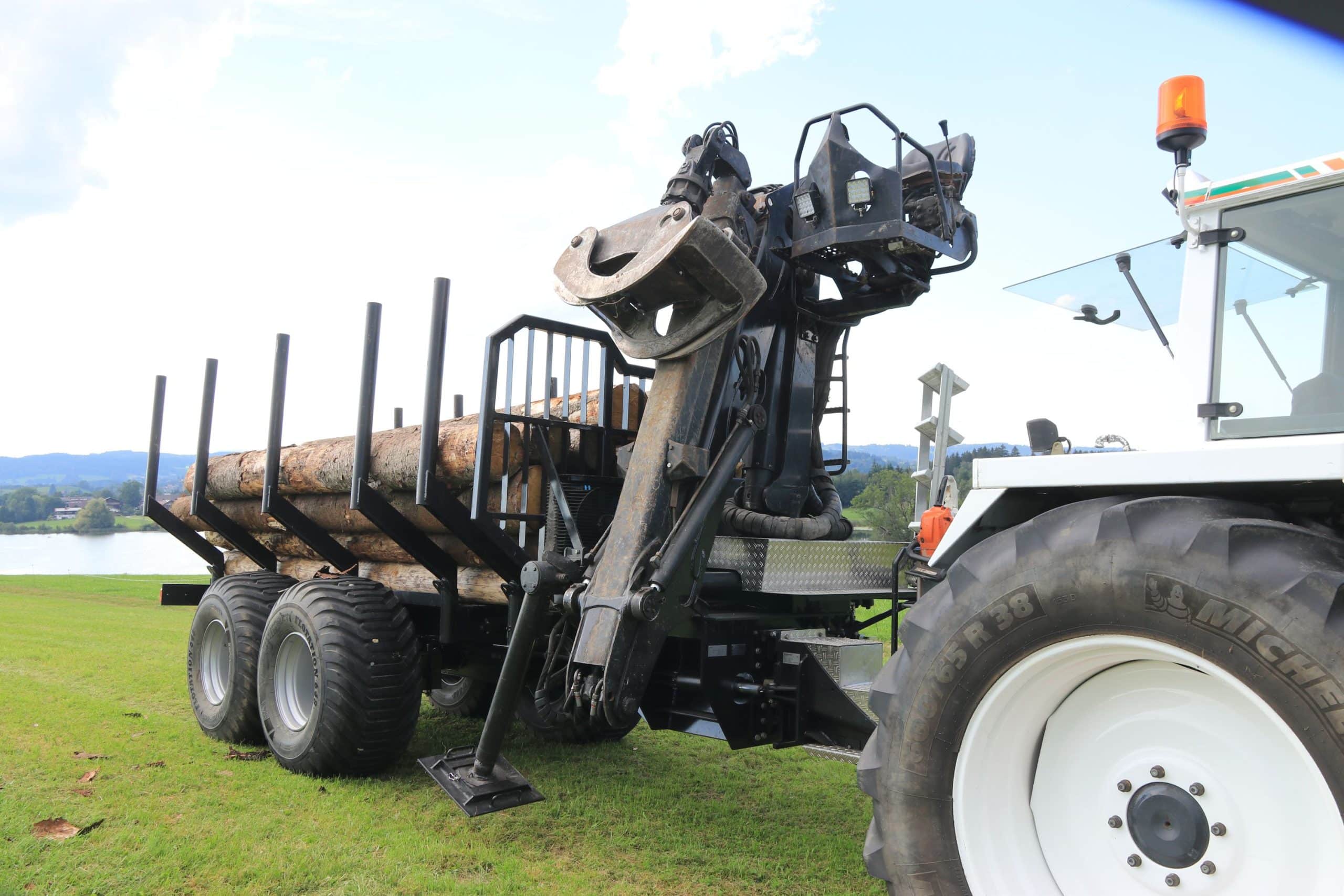 Der Bedarf an einem eigenen Rückewagen entstand bei Maximilian Bertele über Umwege. Der Landwirtschaftsmeister betreibt zusammen mit seinen Eltern und seiner Freundin einen Milchviehbetrieb in Sulzberg, Allgäu. 2020 hat die Familie ein kleines Nahwärmekraftwerk mit Hackschnitzelheizung gebaut, das neun Wohneinheiten versorgt. „Früher haben wir das Holz mit dem Frontlader auf den Kipper geladen und heim transportiert. Für größere Mengen war das aber unpraktisch“, blickt Bertele zurück. Dann folgte die Idee, sich einen Krananhänger zuzulegen. Doch gute gebrauchte Rückewagen in seiner Wunschausstattung gab es nicht.