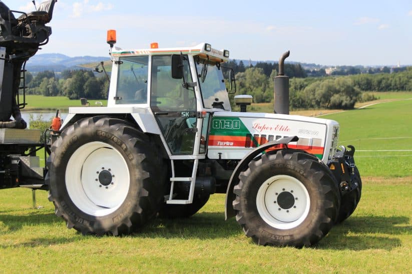 Auffallend an diesem Traktor ist die Lackierung in der Sonderedition „Super Elite“. Bertele konnte ihn 2019 bei einer Auktion in den Niederlanden ersteigern. Der Steyr 8130 hat ein Deutz-Getriebe mit Lastschaltstufe sowie Superkriechgang und daher 48 Vorwärts- und 12 Rückwärtsgänge. Vorne läuft die laut Bertele selten verbaute Carraro-Vorderachse mit Ölbad-Bremsen. Der Traktor glänzt zudem durch die 40-km/h-Ausführung, einen zusätzlichen Hydrauliköltank und -kühler, vier doppeltwirkenden und einem einfachwirkenden Steuergerät sowie einem drucklosen Rücklauf.