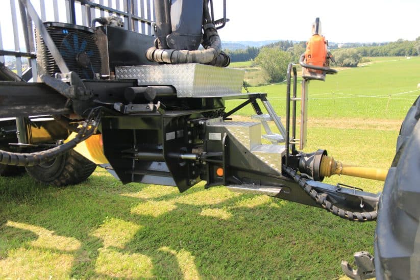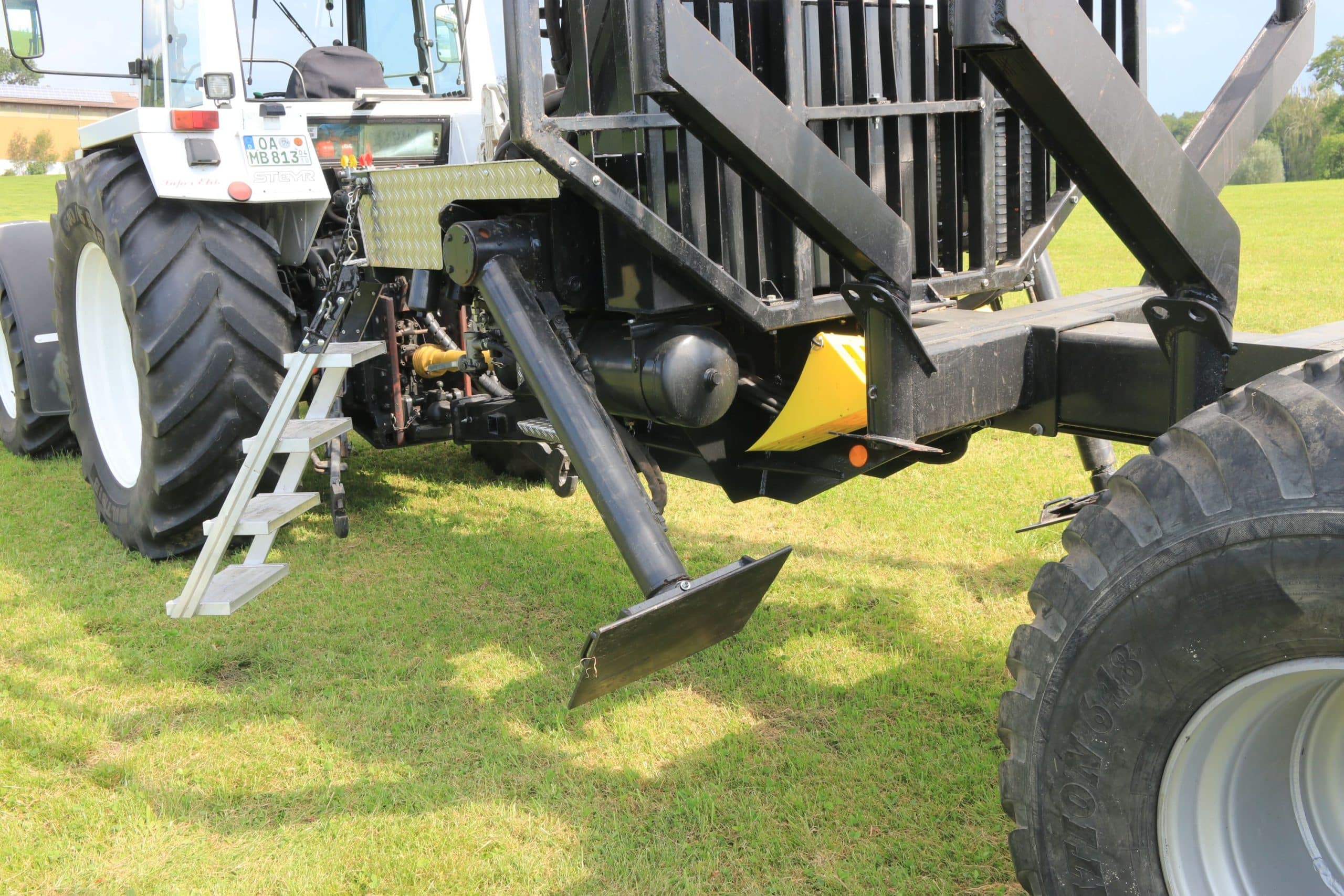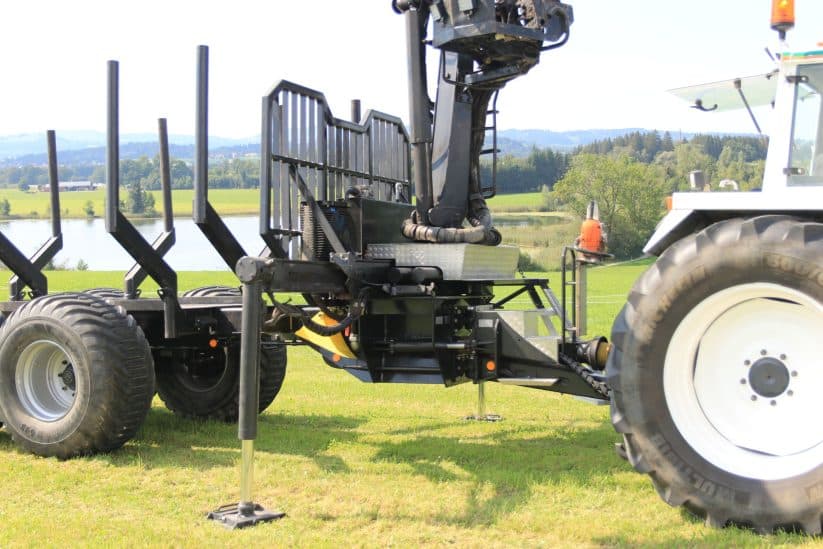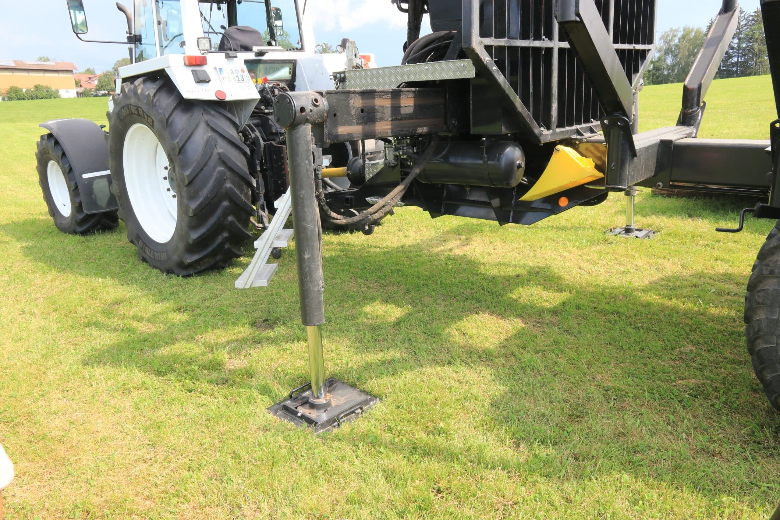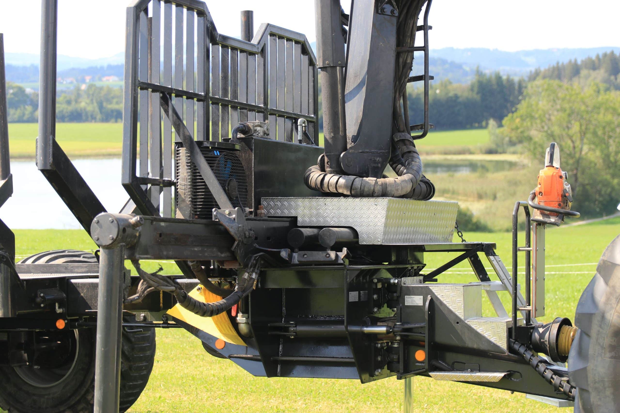 Vom LKW stammt auch die große Hydraulikpumpe mit einer ordentlichen Förderleistung von 105 l/min. Sie wird per Zapfwelle vom Traktor angetrieben. Das eigene Hydrauliksystem des Kranwagens machen ein Öltank, ein Ölkühler und die Zweikreis-Bedienung am Hochsitz komplett. Die Stützen schieben – wie bei einem LKW-Kran üblich – zur Seite aus. Beim Einziehen schwenken sie selbstständig um etwa 45° nach hinten, um die Bodenfreiheit zu erhöhen. Für die Unterlegplatten der Abstützung gibt es praktische Halterungen am Hänger. Ebenso LKW-Dimensionen hat die Öffnungsweite der Zange mit 1,85 m und Endlosrotator.
