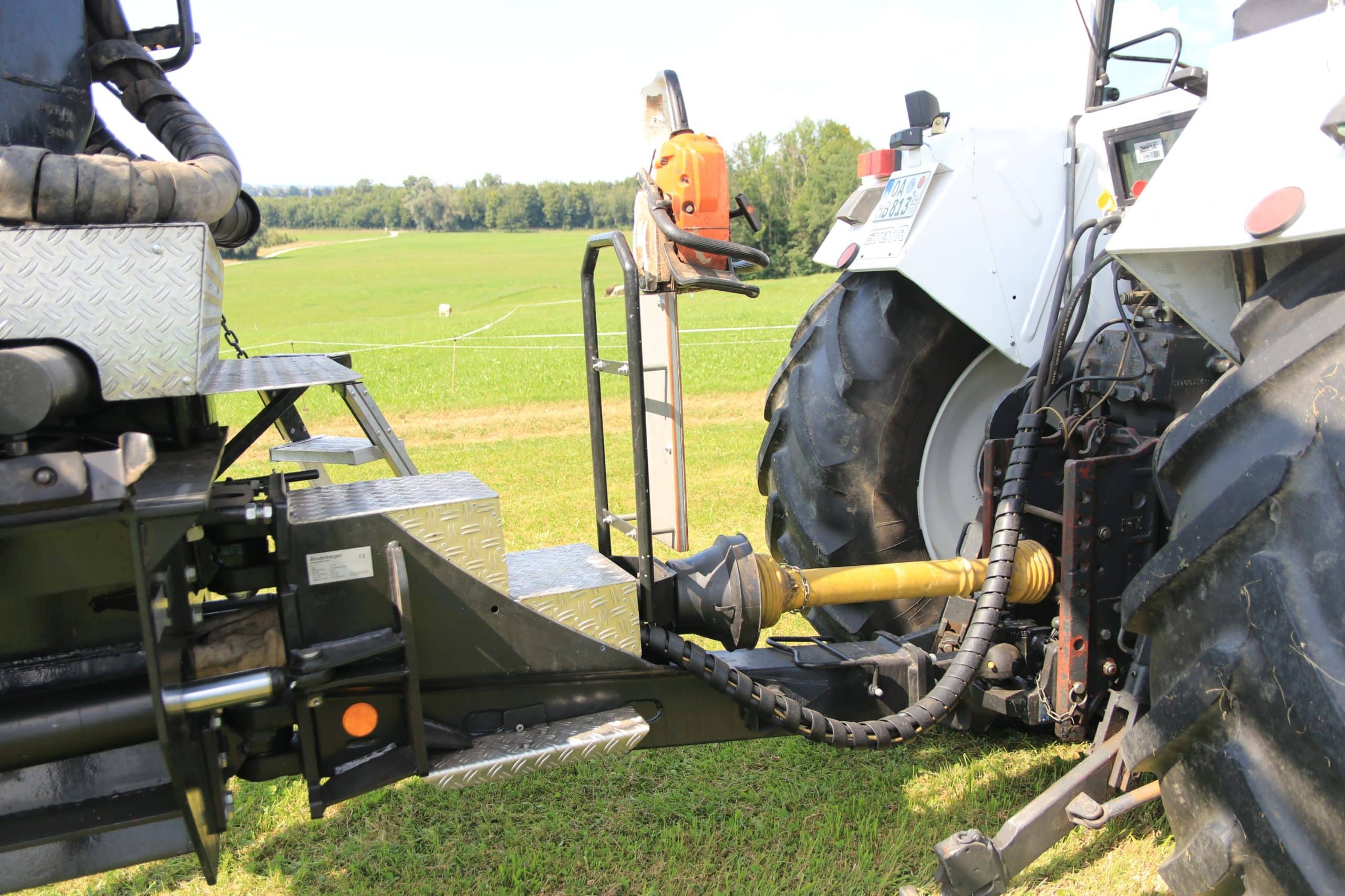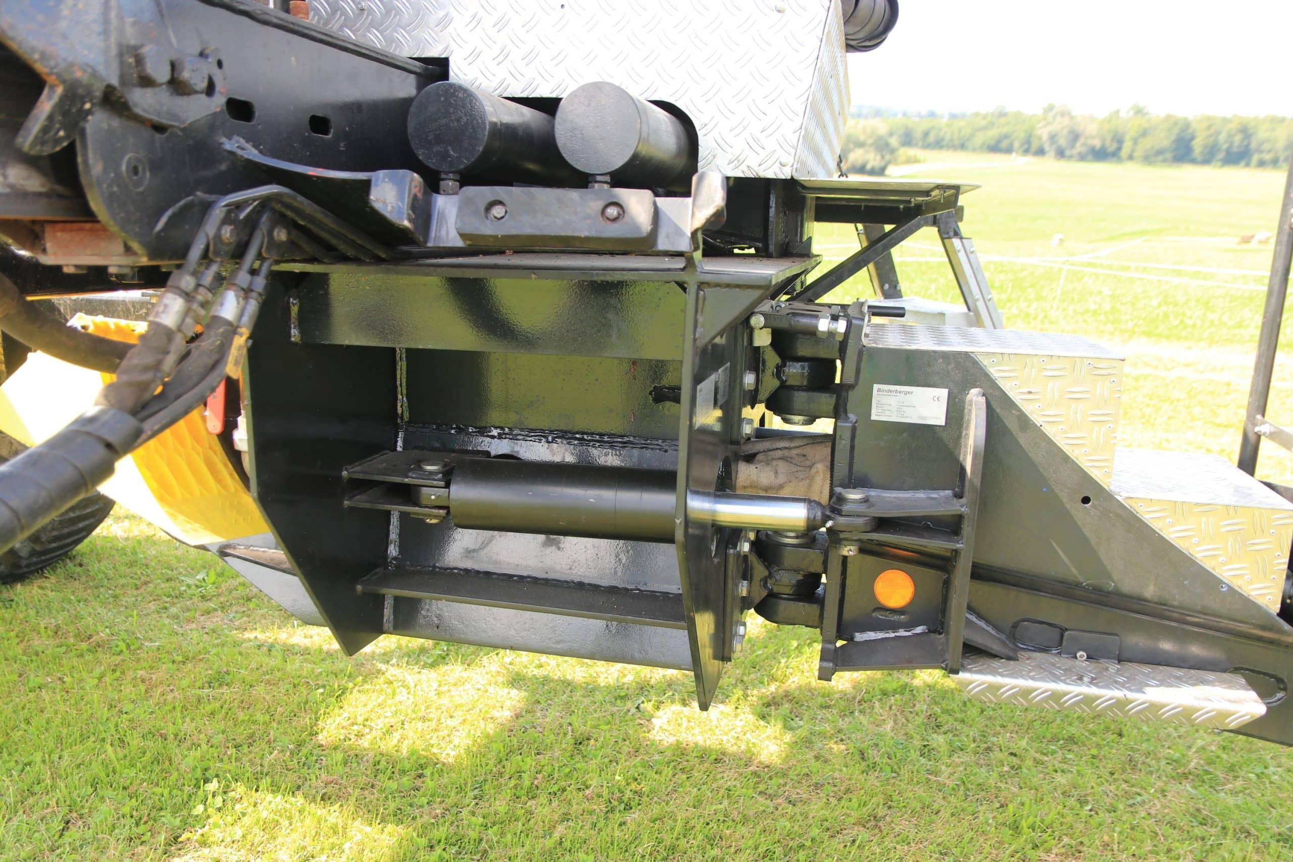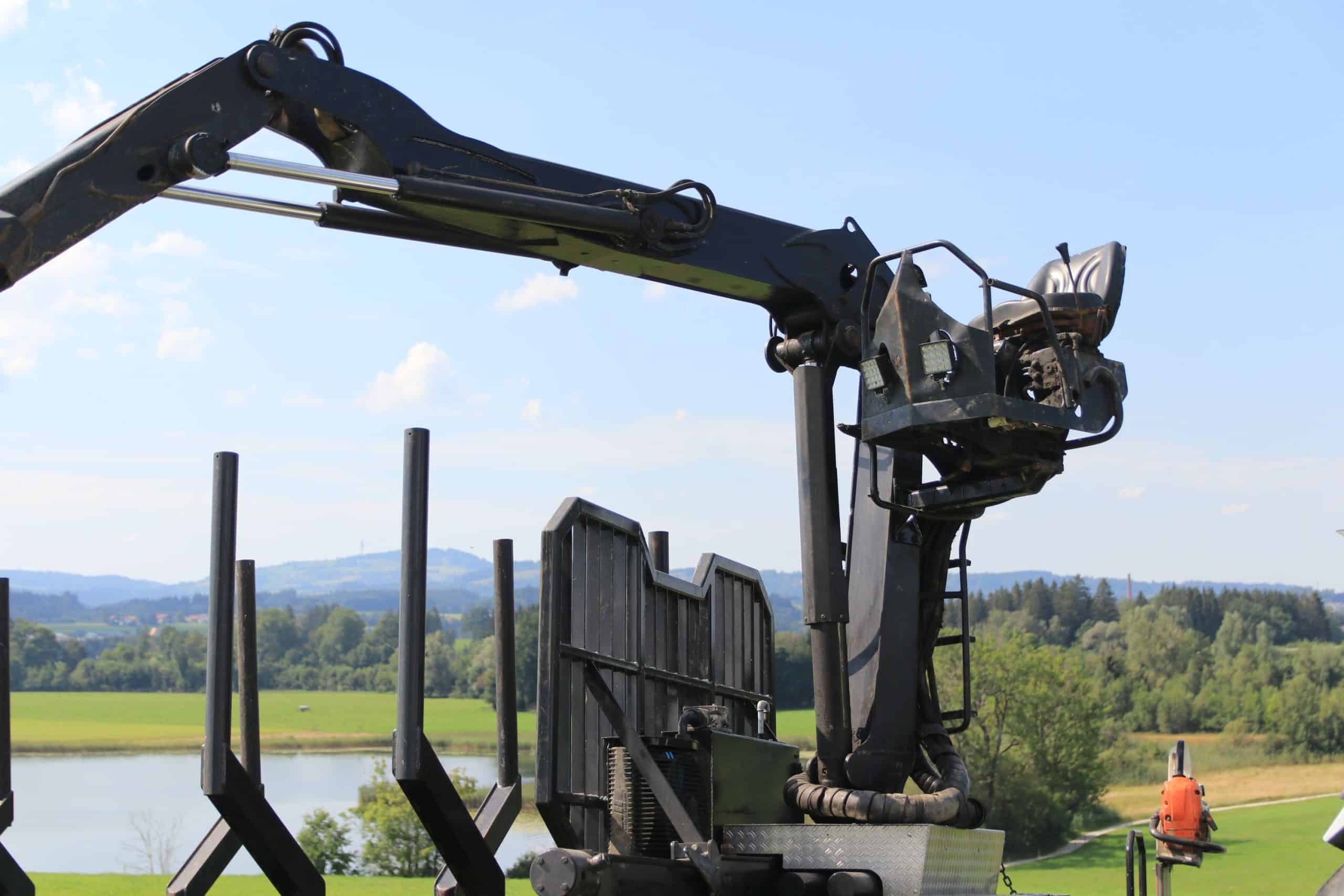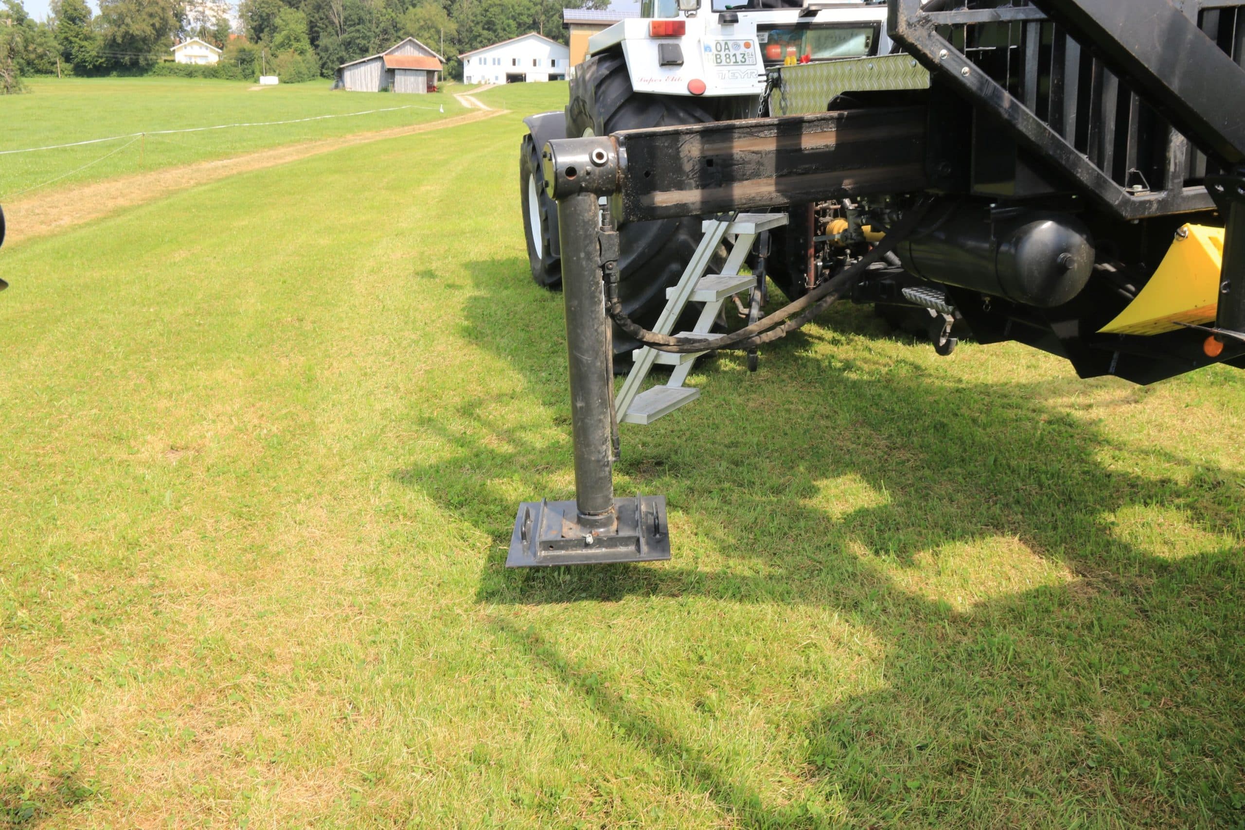 Vom LKW stammt auch die große Hydraulikpumpe mit einer ordentlichen Förderleistung von 105 l/min. Sie wird per Zapfwelle vom Traktor angetrieben. Das eigene Hydrauliksystem des Kranwagens machen ein Öltank, ein Ölkühler und die Zweikreis-Bedienung am Hochsitz komplett. Die Stützen schieben – wie bei einem LKW-Kran üblich – zur Seite aus. Beim Einziehen schwenken sie selbstständig um etwa 45° nach hinten, um die Bodenfreiheit zu erhöhen. Für die Unterlegplatten der Abstützung gibt es praktische Halterungen am Hänger. Ebenso LKW-Dimensionen hat die Öffnungsweite der Zange mit 1,85 m und Endlosrotator.