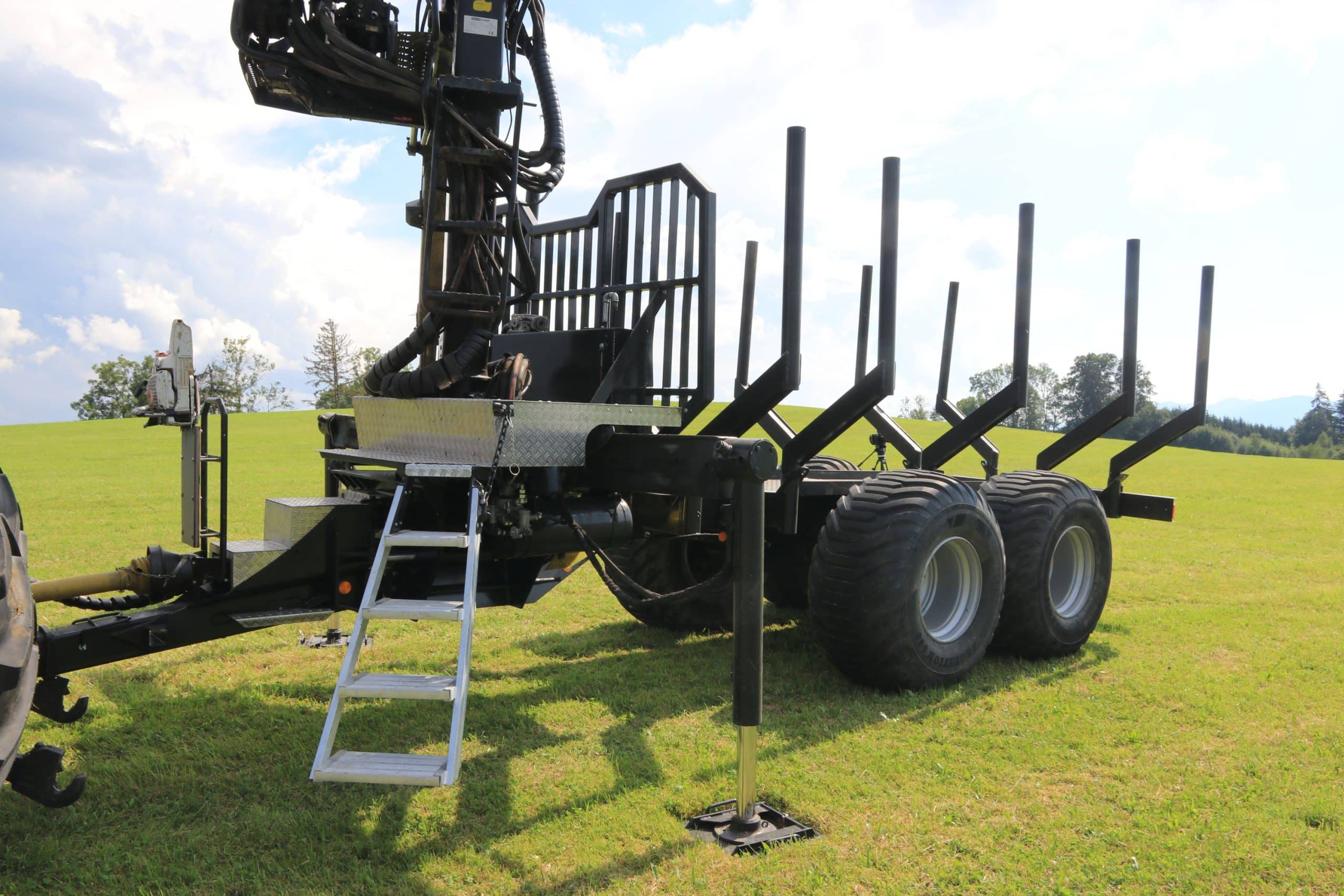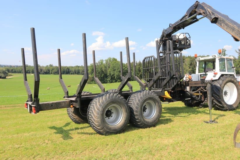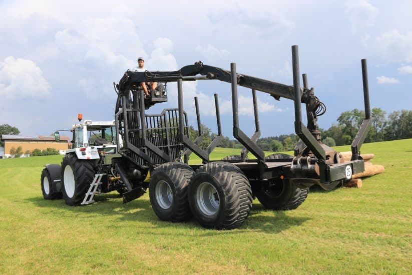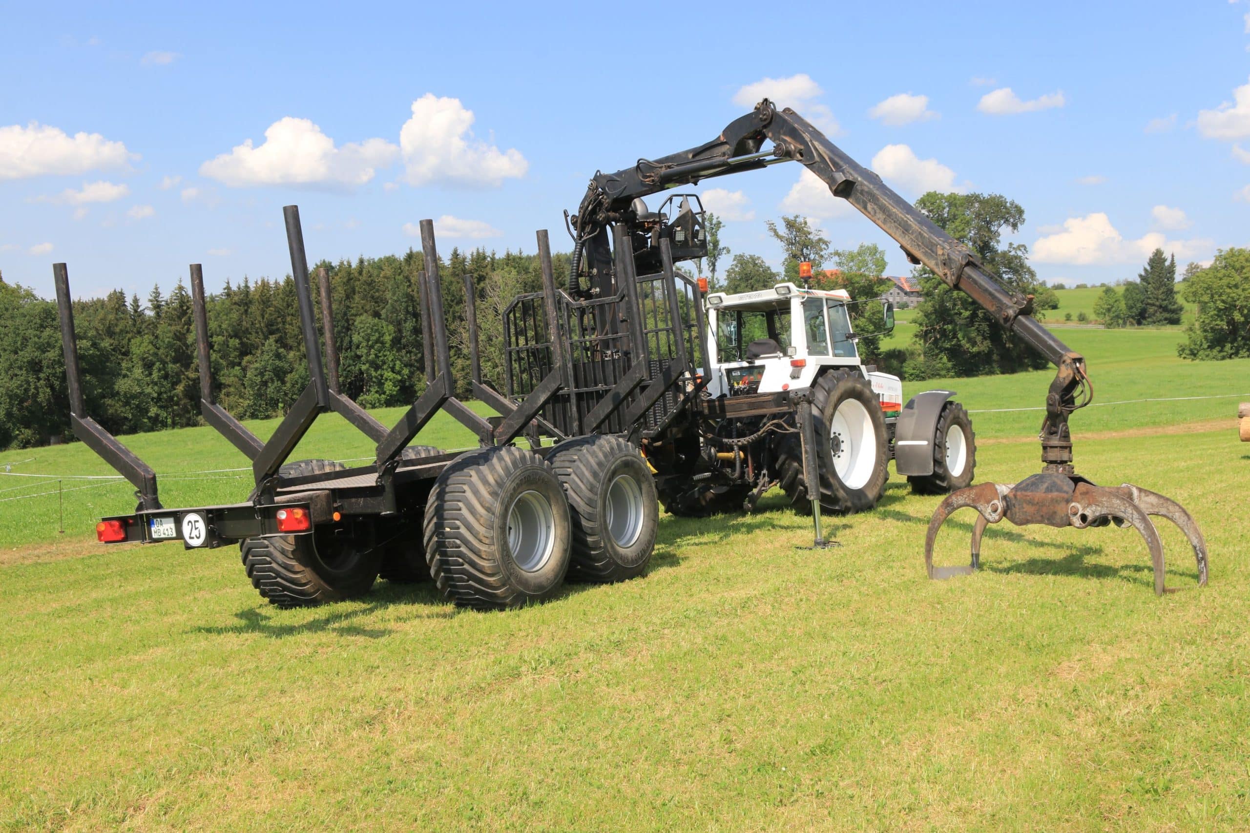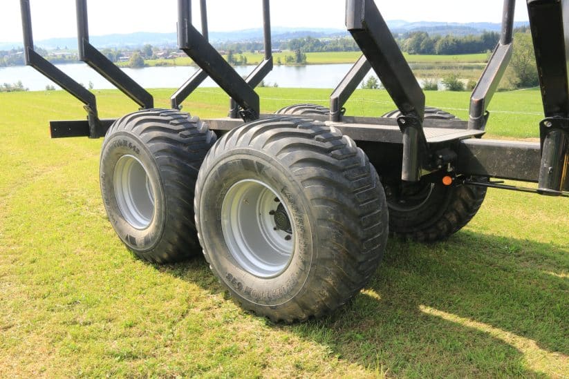 „Nachdem ich diesen Kran gekauft hatte, suchte ich ein Fahrwerk“, so Bertele. Im Wald wäre ein Boogie-Fahrwerk vorteilhaft. „Nach so einem habe ich lange gesucht und mir mehrere angeschaut. Viele waren aber ausgeschlagen.“ Schließlich fand er doch eines, das aus einem Häckselwagen des Herstellers Annaburger stammte. Besonders daran sind die große Nutzlast von 14 t bei 40 km/h und die relativ große Bereifung in der Dimension 600/55-22.5. „Die große, bodenschonende Bereifung wollte ich haben, weil viele unserer Waldflächen nur über Felder und Wiesen erreichbar sind, also kein Forstweg hinführt“, erklärt Maximilian Bertele.