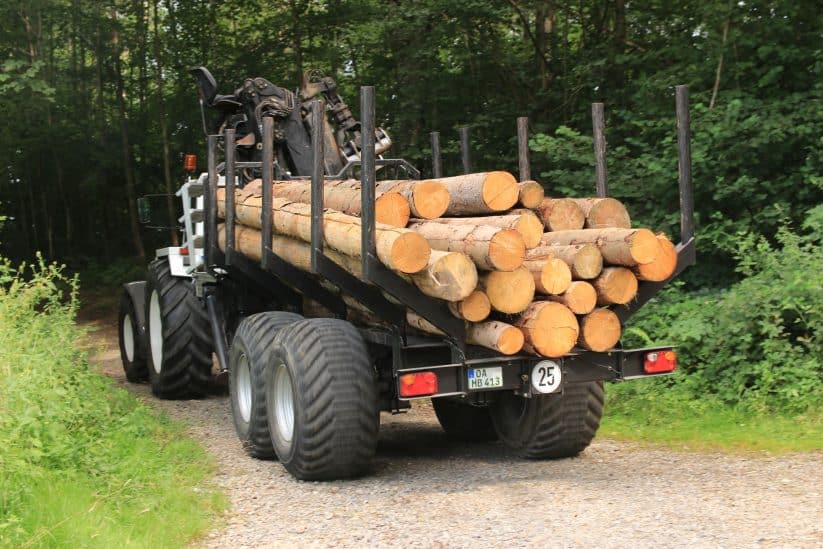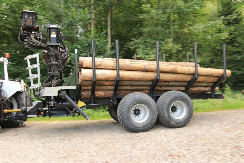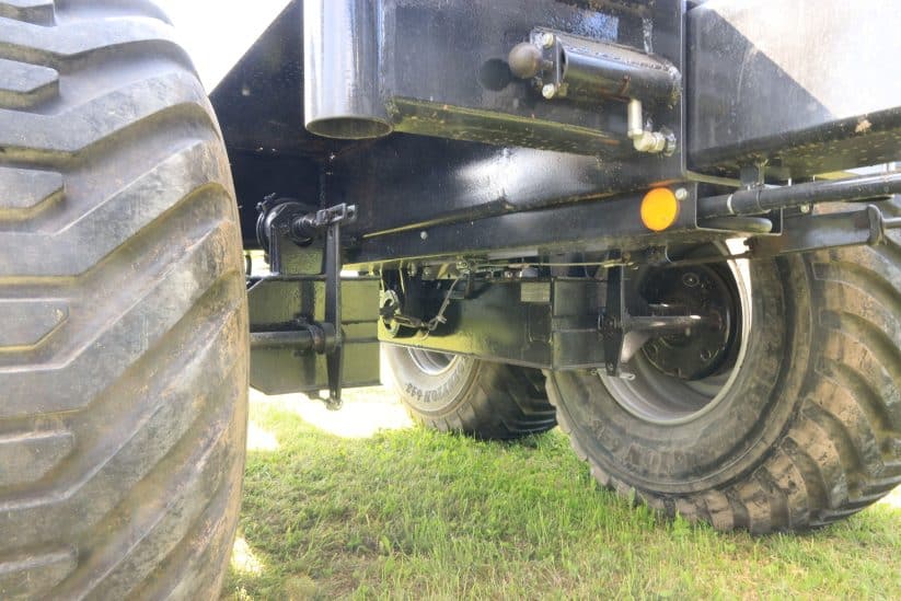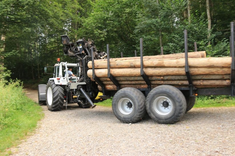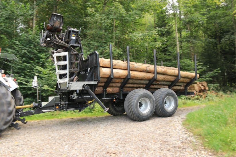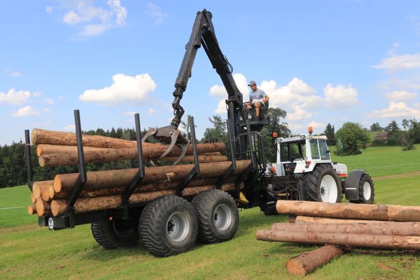 „Nachdem ich diesen Kran gekauft hatte, suchte ich ein Fahrwerk“, so Bertele. Im Wald wäre ein Boogie-Fahrwerk vorteilhaft. „Nach so einem habe ich lange gesucht und mir mehrere angeschaut. Viele waren aber ausgeschlagen.“ Schließlich fand er doch eines, das aus einem Häckselwagen des Herstellers Annaburger stammte. Besonders daran sind die große Nutzlast von 14 t bei 40 km/h und die relativ große Bereifung in der Dimension 600/55-22.5. „Die große, bodenschonende Bereifung wollte ich haben, weil viele unserer Waldflächen nur über Felder und Wiesen erreichbar sind, also kein Forstweg hinführt“, erklärt Maximilian Bertele.