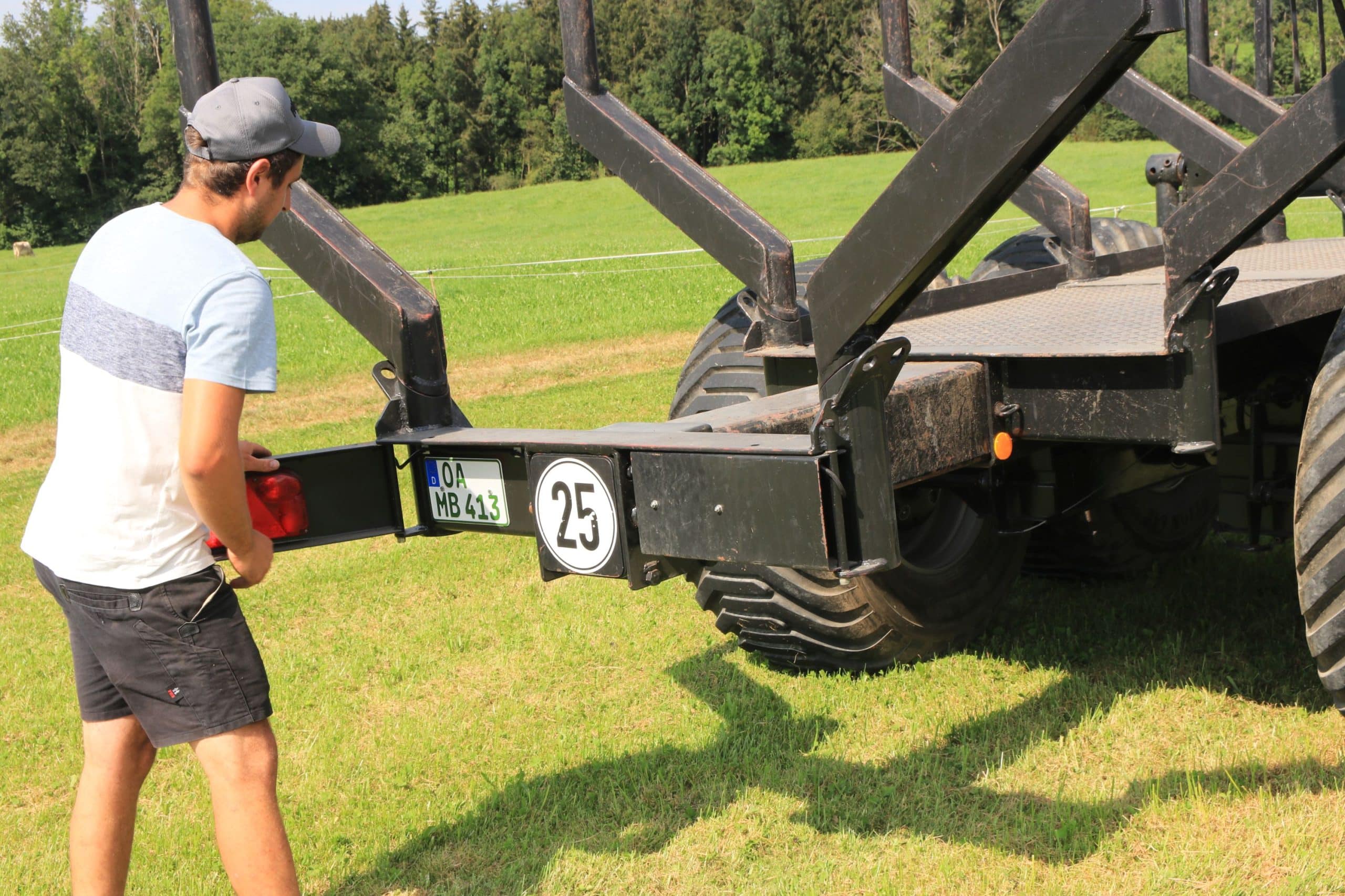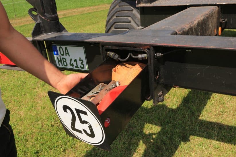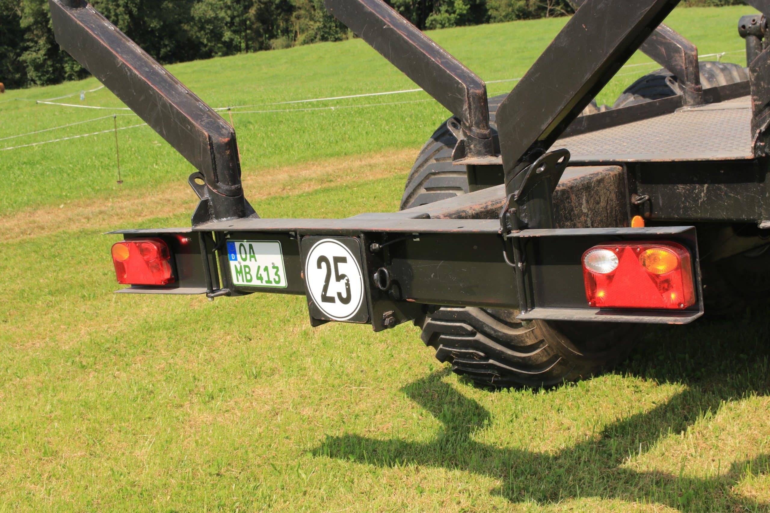 Die Lenkdeichsel mit 25° Einschlagwinkel auf beiden Seiten war das einzige (von einem Kranwagenhersteller) neu zugekaufte Teil am gesamten Kranwagen von Maximilian Bertele. „Da wollte ich auf Nummer sicher gehen und eine Prüfnummer sowie ein Prüfzeichen haben, damit ich im Straßenverkehr vorschriftsmäßig unterwegs bin.“ Der druckluftgebremste Wagen ist vom TÜV abgenommen und hat eine Einzelbetriebserlaubnis. Daher darf er so, wie er jetzt ist, zulassungsfrei mit 25 km/h auf öffentlichen Straßen bewegt werden. Für eine 40 km/h-Zulassung müssten lediglich ein Unterfahrschutz und Kotflügel montiert werden. Die höhere Geschwindigkeit braucht Bertele für seine nahen Waldflächen aber nicht und diese Schutzeinrichtungen wären im Forst hinderlich. Die vorgeschriebene Beleuchtung kann er im Wald nach innen klappen, sie ist dann komplett geschützt. Außerdem hat er im Heck des Zentralrohres eine Schublade für Spanngurte und Werkzeug eingebaut.