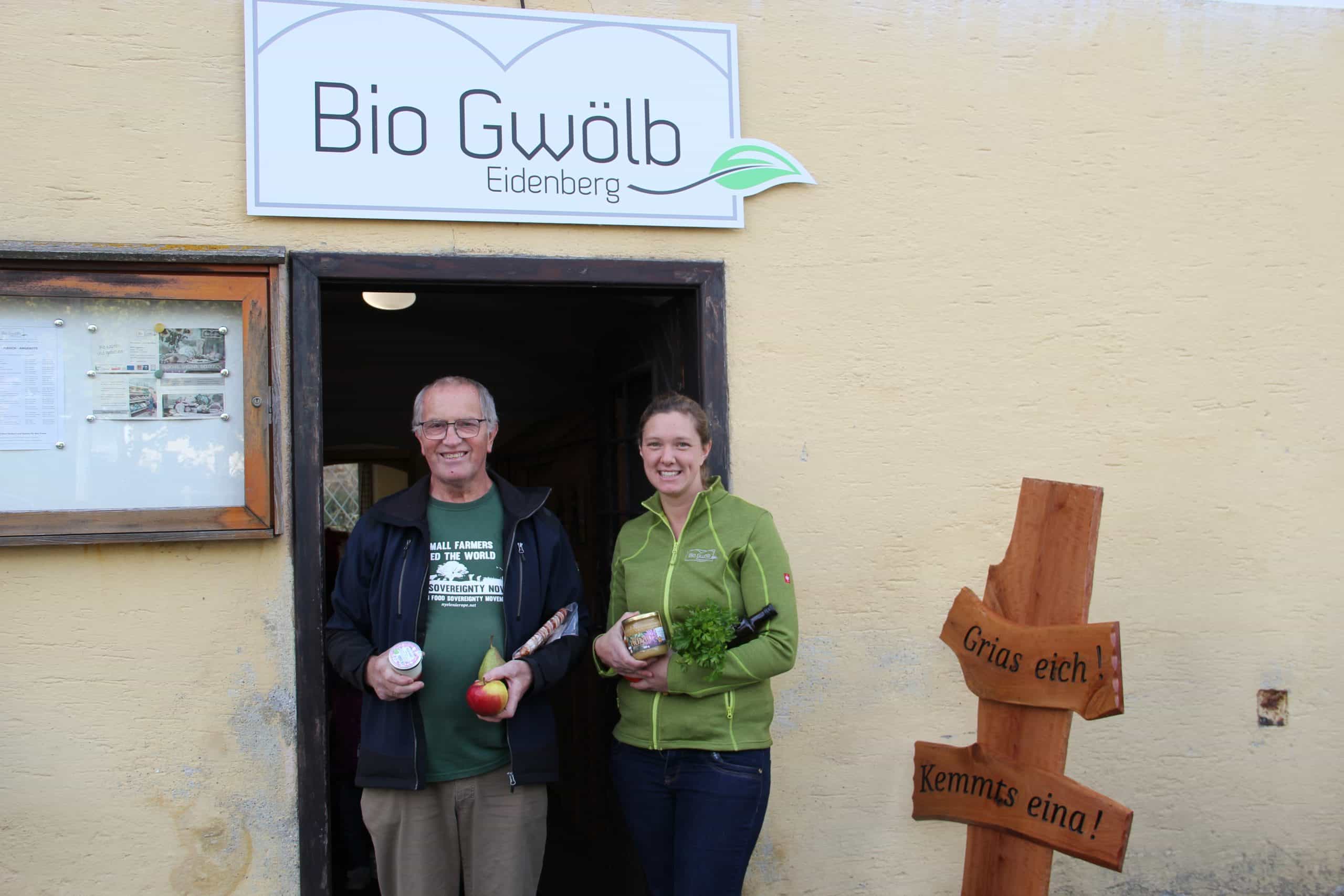 Gottfried und Lisi Mair mit ihrem Team sind die Initiatoren des Bio Gwölb’s. Der Landwirt erinnert sich: „Wir wollten damals biologische Lebensmittel produzieren, es gab aber keine Abnehmer dafür. Deshalb stand schon früh für uns fest, dass nur eine gemeinsame Vermarktung mit anderen Höfen Sinn macht.“ Nach einem Ausflug nach Zwettl zum Edelhof entschlossen sich die Bio-Bauern dazu. Sie suchten sich eine Räumlichkeit zum Verkauf der Bio-Lebensmittel. Fündig wurden sie glücklicherweise in ihrem Ort. „Wir haben uns beim Stift Wilhering in Eidenberg einmieten können. In diesem Rundhof sind verschiedene Vereine zu finden. Als wir 1993 begannen, hatten wir nur einen Raum, mittlerweile sind es zwei Verkaufsräume und etwas Lagerplatz“, erzählt der Bio-Bauer. Der Name – Bio Gwölb – entstand aufgrund des Gewölbes im Verkaufsbereich.