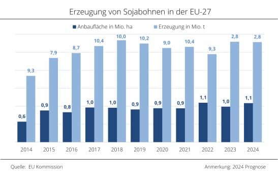 Trotz einer Flächenausweitung von 10 % sank die EU-Sojaernte 2024 um 3,4 % auf 2,8 Mio. t. Hauptgrund waren schwache Hektarerträge infolge von Hitze und Trockenheit. Der durchschnittliche Ertrag lag bei 25,7 dt/ha und damit unter dem Vorjahresniveau (28,3 dt/ha) sowie dem langjährigen Mittel (28,1 dt/ha). Besonders betroffen war Rumänien, wo die Hektarerträge auf 16 dt/ha einbrachen, was die Ernte trotz einer Flächenausweitung von 10 % um 44 % auf 171.000 t sinken ließ. Italien blieb mit 1 Mio. t zwar EU-Spitzenreiter, verzeichnete aber mit 31,3 dt/ha ebenfalls einen Rückgang gegenüber 2023.