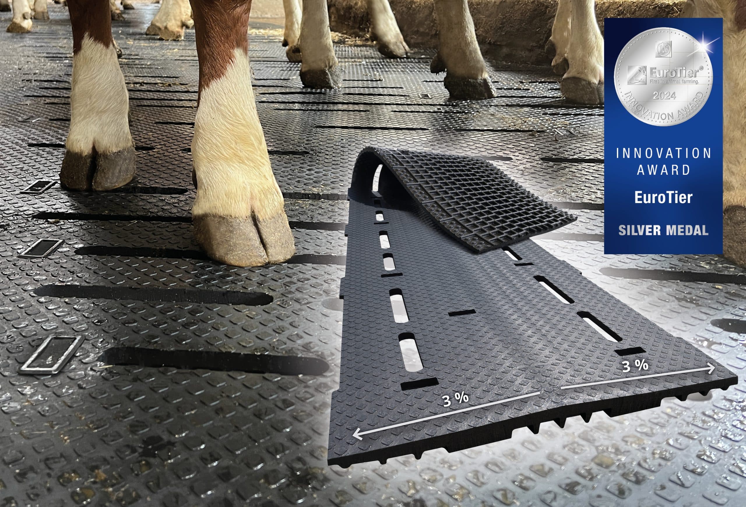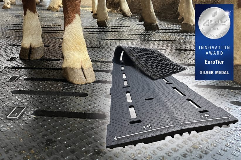 Dank der ausgeklügelten Konstruktion kann das Schlitzbild variabel gestaltet und die Anzahl der Schlitze deutlich reduziert werden. Das partielle Verschließen des Güllelagers reduziert somit die Ammoniak-Freisetzung. Gleichzeitig leitet das beidseitige Gefälle von 3 % in der Gummimatte Flüssigkeiten schnell und zuverlässig ab. Die Ergebnisse: trockene, gesunde Klauen und weniger Ammoniak. espaFLEX ist für jede Spaltengeometrie einsetzbar und einfach nachrüstbar.
