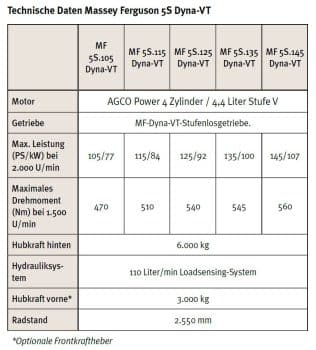 Alle fünf Modelle der MF 5S-Serie von 105 PS bis 145 PS mit den Ausstattungsvarianten „Efficient“ (mittlere Leistung) und „Exclusive“ (höchste Leistung) sind mit Dyna-VT-Getriebe erhältlich. Käufer von Maschinen mit der Basisausstattung „Essential“ haben die Wahl zwischen Dyna-4- und Dyna-6-Getriebe.