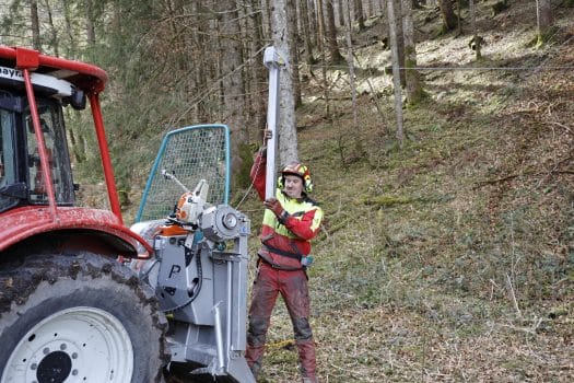 Die Hydraulikschläuche führen von der Traktorhydraulik über einen Steuerblock zum Nabenmotor. Die Trommel wird über eine zweistufige Kupplung mit der Nabe verbunden. Das Seil läuft durch eine drehbare Seileinlaufrolle mit Stahlstiftbremse.