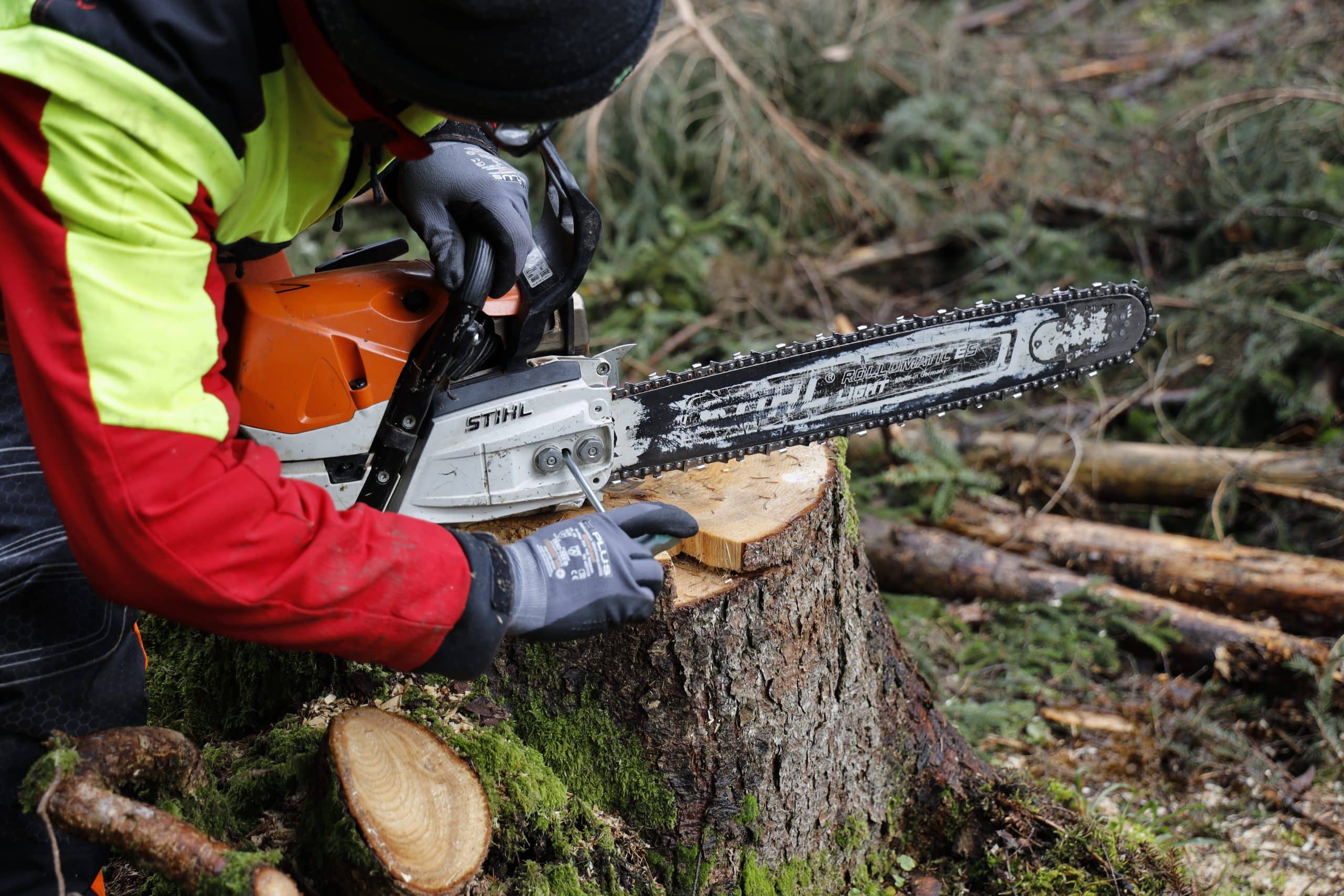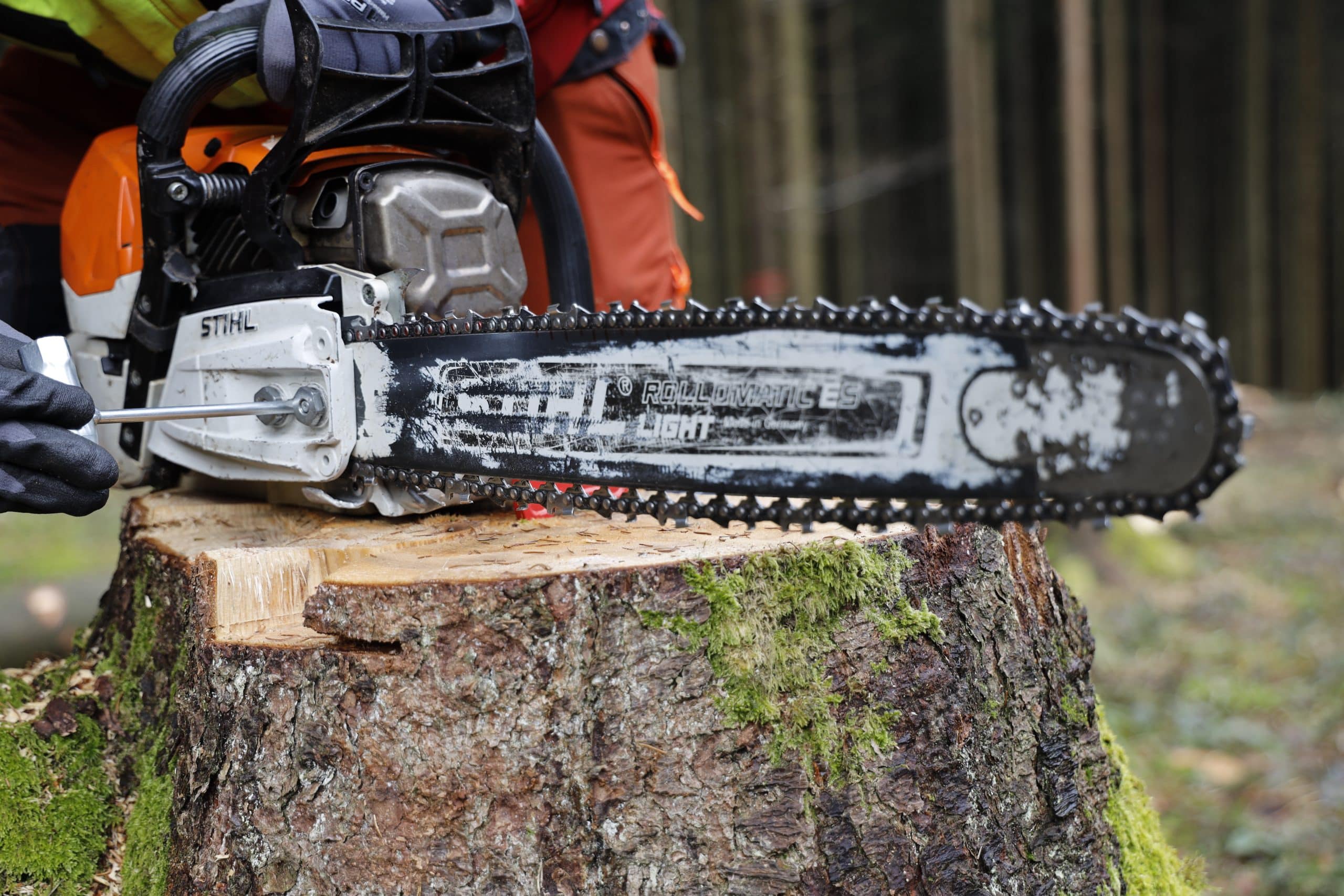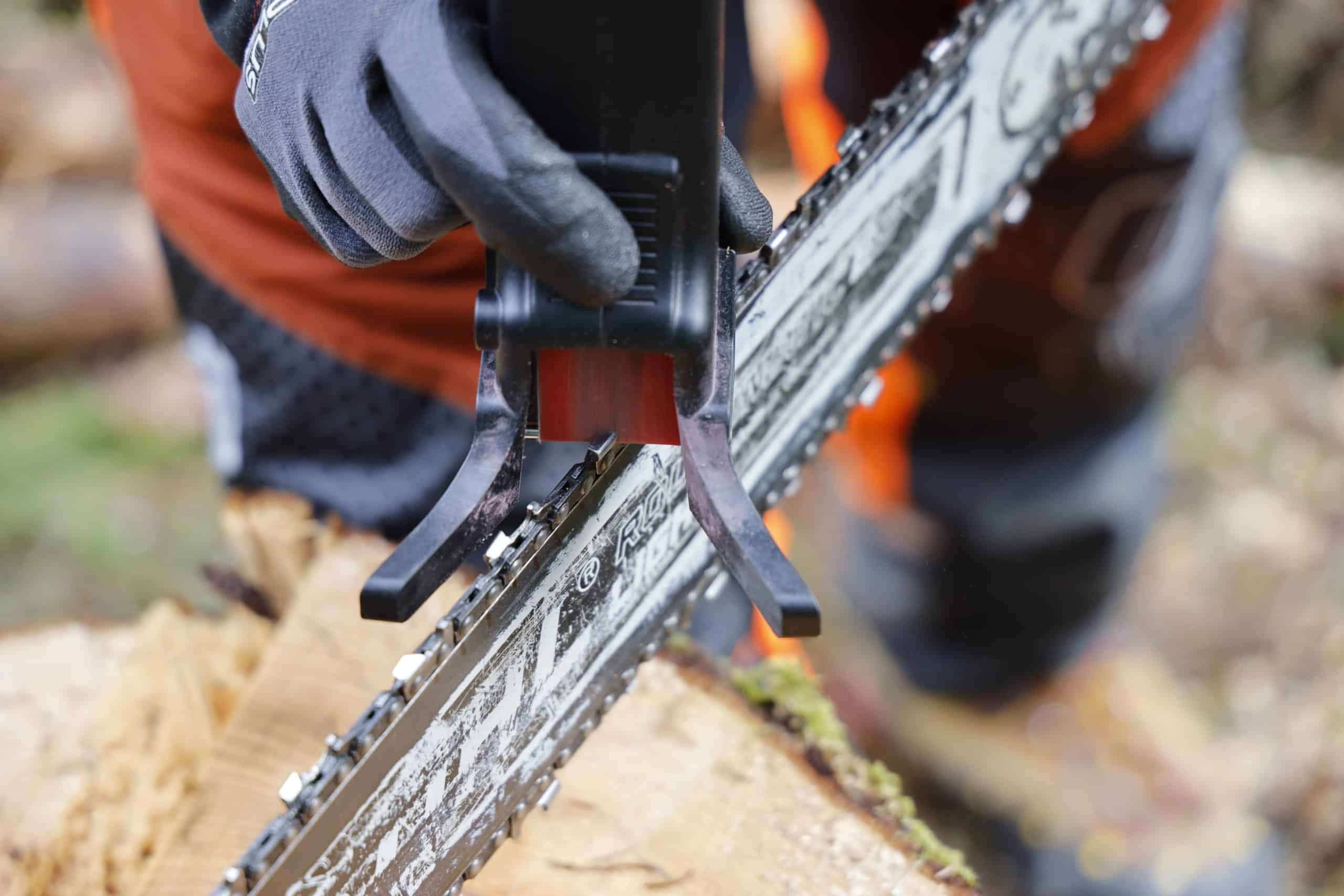 Für die richtige Führung des Sägekettenschärfgerätes Schleiferl und eine gute Sicht auf die Kettenzähne ist die Höhe des Arbeitsplatzes wichtig. Der Hersteller empfiehlt zwischen Schulter und der Sägekette einen Abstand von mindestens 50 cm. Ein Schraubstock auf der Werkbank war in unserem Test zu hoch. Im Wald war es für uns einfacher, auf einem großen abgesägten Baumstumpf die passende Höhe zu finden. Eine Klemmvorrichtung, wie wir sie verwendet haben, ist von Vorteil, aber nicht zwingend notwendig.
