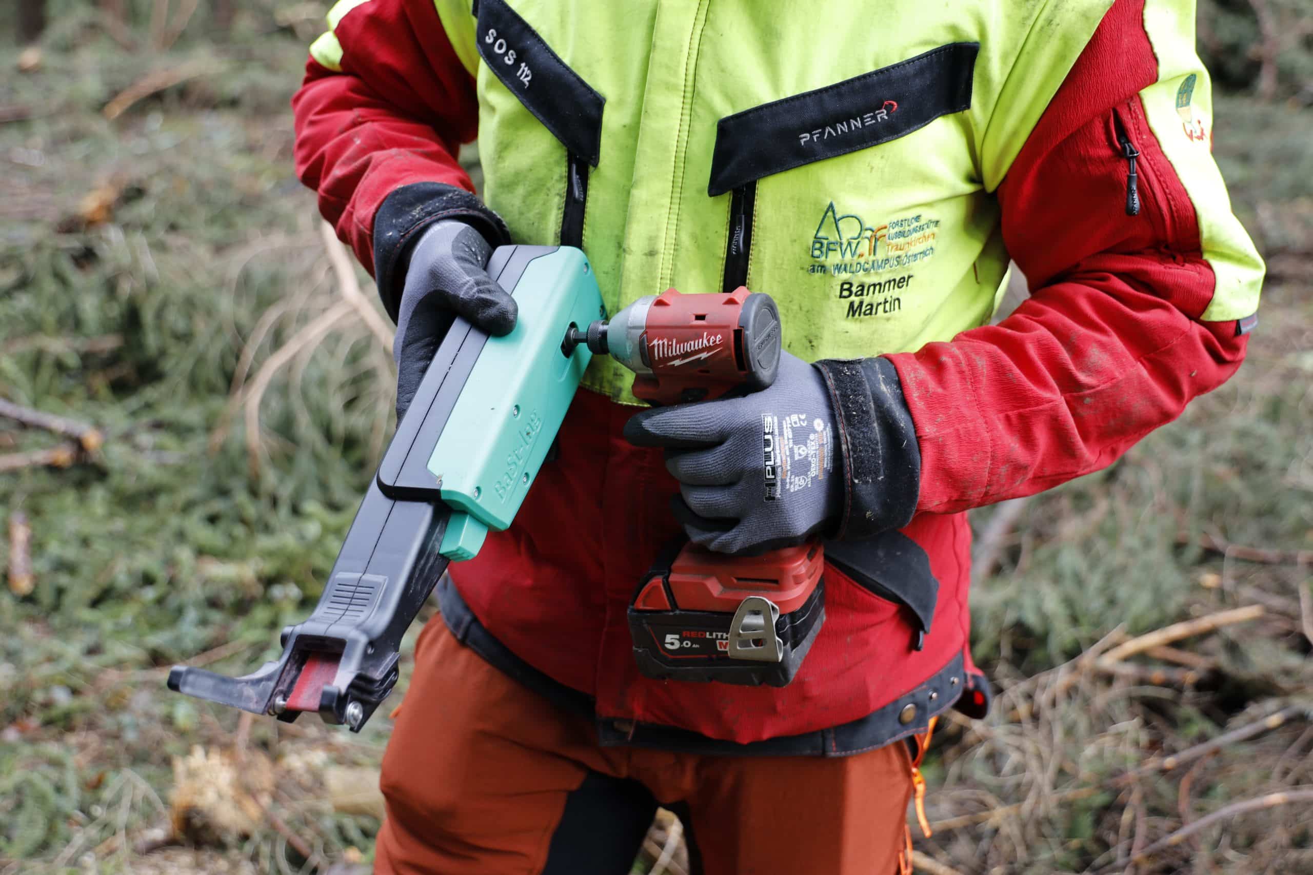 Ein handelsüblicher Akku-Bit-Schrauber treibt das Schleifband an. Wichtig bei der Maschinenauswahl: Für einen einwandfreien Schliff braucht das Schleiferl eine Drehzahl zwischen 3.000 und 4.500 U/min. Zudem sollte der Schrauber leicht sein. Bei Bedarf bietet Bast-Ing ein passendes Gerät in seinem Webshop an.
