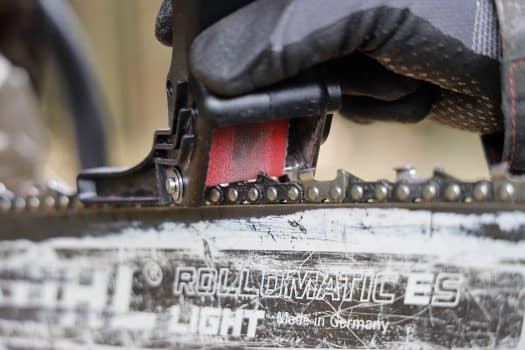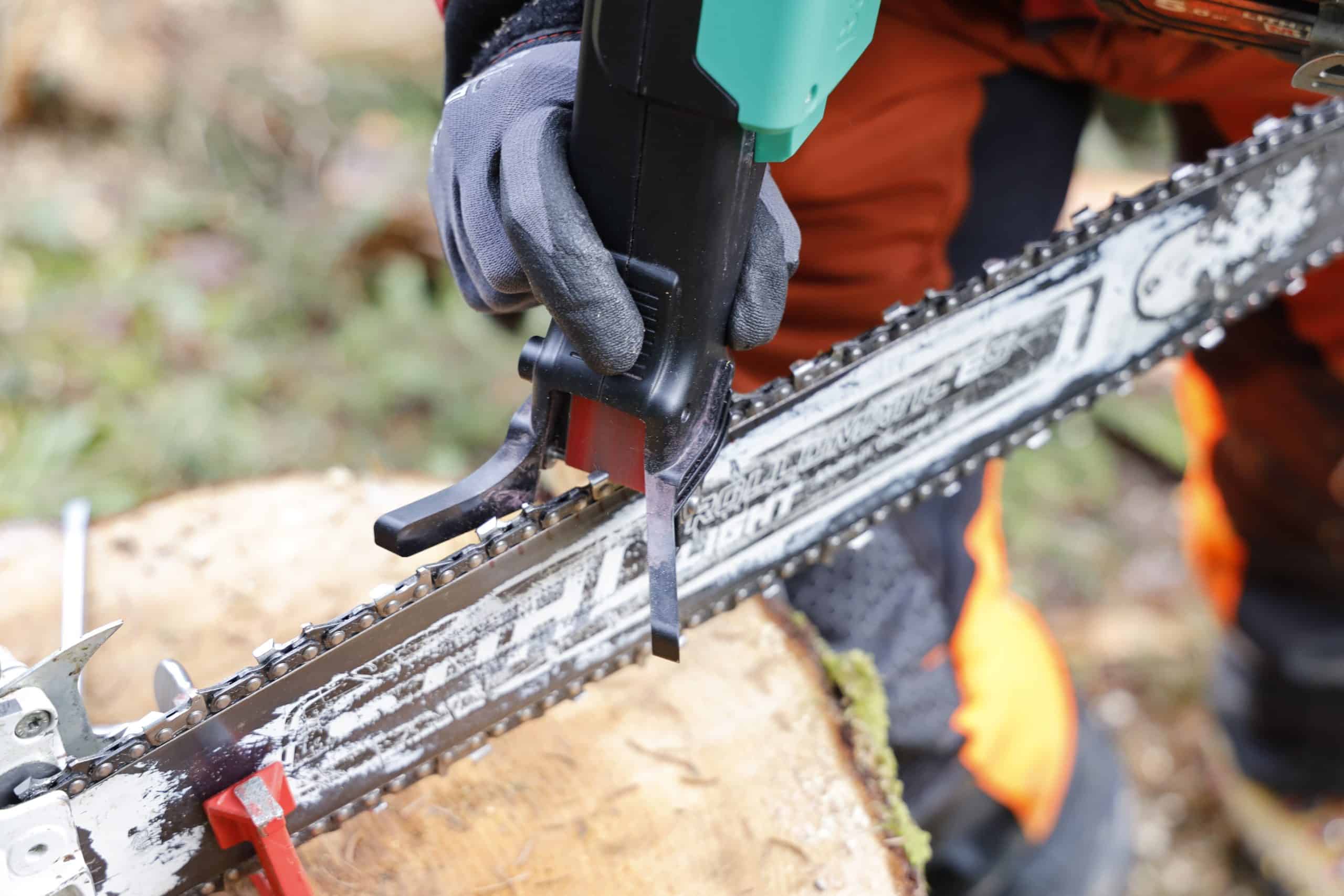 Die Kette sollte so gespannt sein, dass man sie beim Schleifen nicht zurückschiebt. Gleichzeitig sollte man sie aber nach ein paar geschliffenen Zähnen mit der Hand nachziehen können. Zudem kippen die Zähne bei satter Kettenspannung während des Schleifvorgangs weniger stark zur Seite.