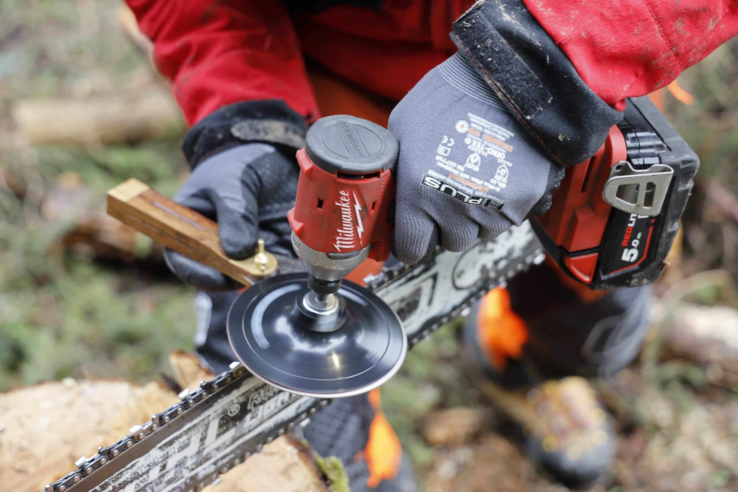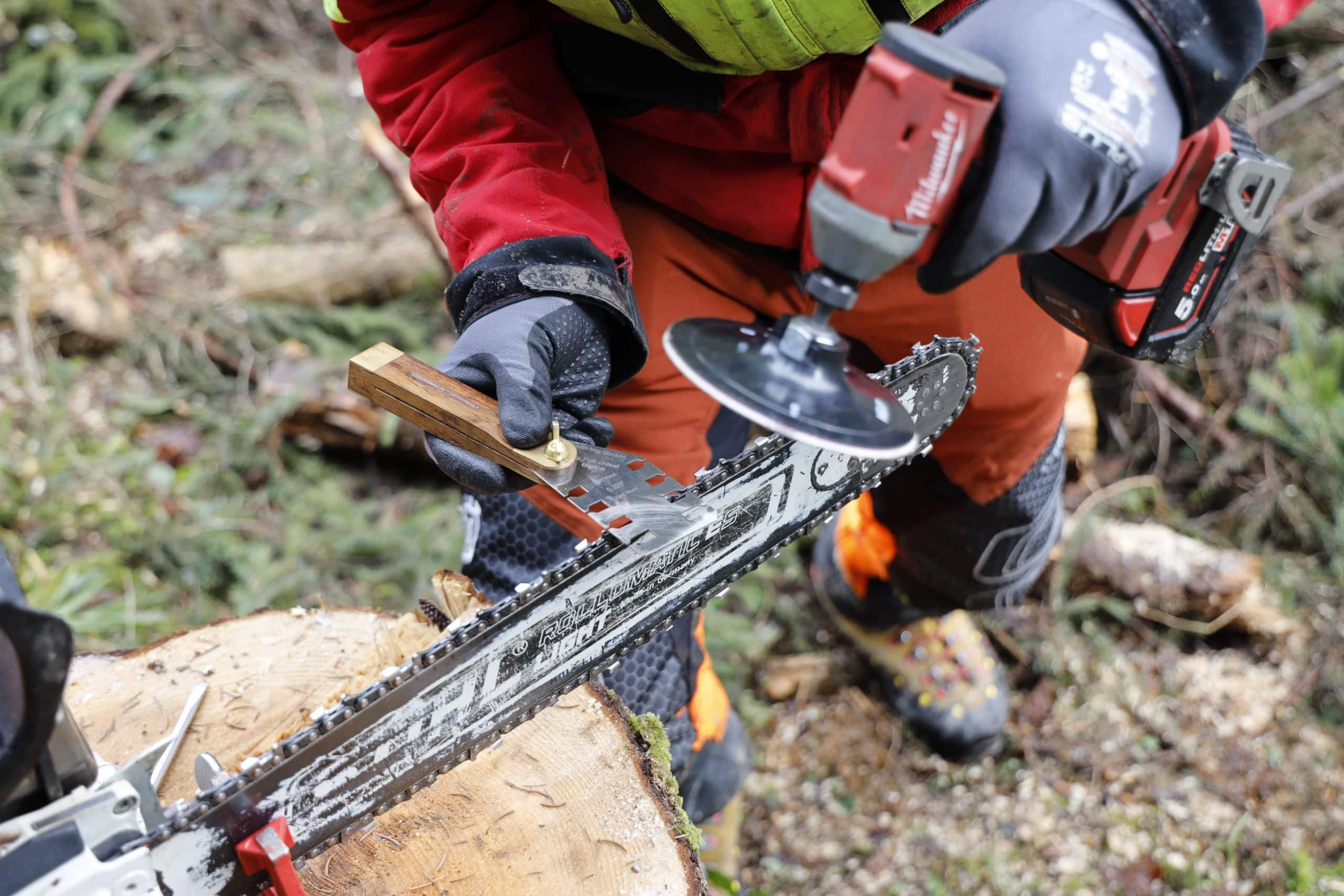 Zuerst bestückt man das Sägekettenschärfgerät Schleiferl mit der passenden Schleifwelle. Dann wird der Akku-Schrauber auf die Antriebswelle gesteckt und schon kann es losgehen: Mit der rechten Hand führt man die Schleifwelle mit dem Schleifband an den Zahn heran. Die linke Hand hält den Schrauber. Das Schleifband schärft das Zahndach von unten nach oben. Der Hauptschliffwinkel lässt sich mit den beiden Flügeln gut kontrollieren. Steht der Flügel parallel zum Schwert, werden die gewünschten 25 oder 30° exakt eingehalten. Der Brustwinkel und das Schleifen der Rundung (= Nebenschneide) hängen stark davon ab, wie steil man das Schleiferl hält. Hält man das Gerät etwas flacher, wird die Rundung schöner ausgeschliffen, was beim Schneiden von Weichholz von Vorteil ist. Hält man es steiler, wird die Rundung etwas kleiner. Die Kette arbeitet weniger aggressiv, was beim Schneiden von Hartholz vorteilhaft ist.