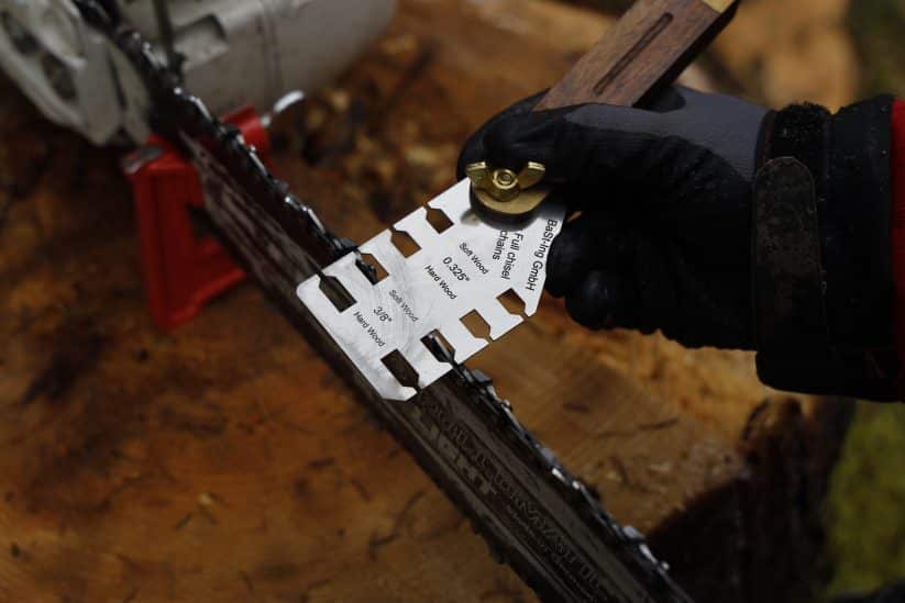 Die Lehre hat für die verschiedenen Kettenteilungen und für die Unterscheidung zwischen Hart- und Weichholz verschiedene Öffnungen.