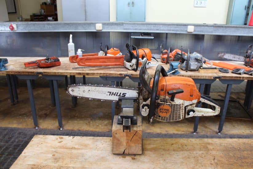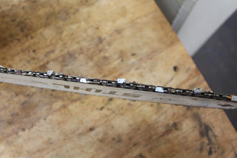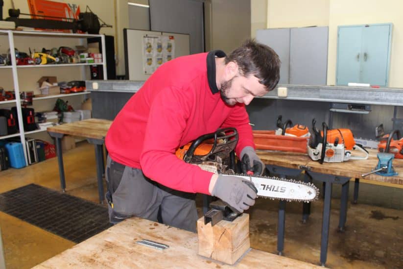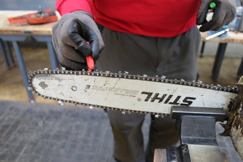 Nach dem Schärfen überprüft Zangl die Kettenspannung. Dafür heben Sie die Schwertspitze an. Die Kette muss an der Unterseite des Schwertes anliegen und dabei an der Oberseite noch mit zwei Fingern bewegbar sein.
