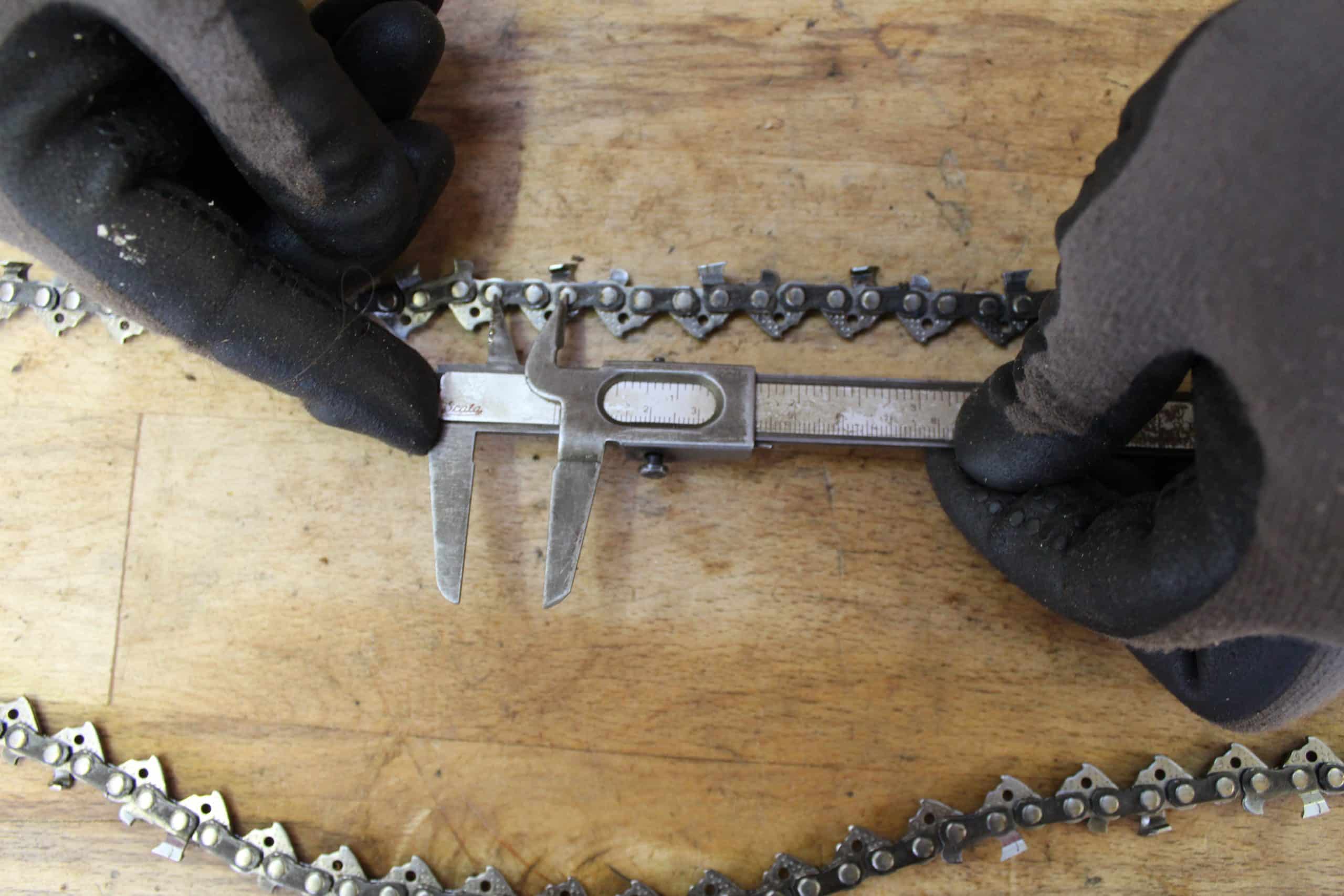 Den korrekten Durchmesser der Feile bestimmen Sie anhand der Kettenteilung. Gängige Kettenteilungen sind 3/8 Zoll, .325 Zoll und 1/4 Zoll. Bei einer Kettenteilung von .325 Zoll beträgt der Ab stand zwischen Niete 1 und Niete 3 beispielsweise 16,5 mm, geteilt durch zwei ergibt das 8,25 mm. Die Kettenteilung ist meistens auch auf dem Schwert vermerkt, jedoch sicher in der Betriebsanleitung. Manche Hersteller kennzeichnen die Sägekette auch mit dem empfohlenen Rundfeilendurchmesser.