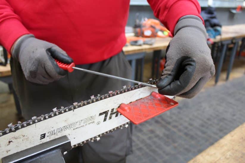 Der Tipp vom Profi: „Die Feile soll im Durchmesser ungefähr 1/5 überstehen. Bei einer zu kleinen Feile kann die Kette reißen. Eine zu große Feile bewirkt einen rückhängenden Zahn, wodurch die Säge ins Holz gedrückt werden muss.“