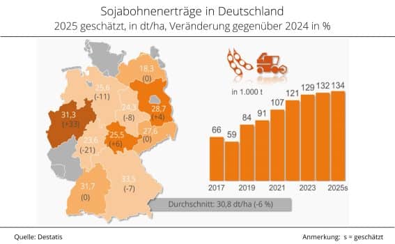 Bayern und Baden-Württemberg bleiben die wichtigsten Soja-Regionen Deutschlands. In Bayern wurden rund 56,8 % der gesamten Sojabohnen geerntet, in Baden-Württemberg etwa 17,6 %. Zusammen entfallen damit fast drei Viertel der deutschen Produktion auf den Süden. Regional entwickelten sich die Erträge unterschiedlich. Besonders positiv fiel Nordrhein-Westfalen auf. Dort stiegen die Erträge um knapp 33 % auf 31,3 dt/ha.