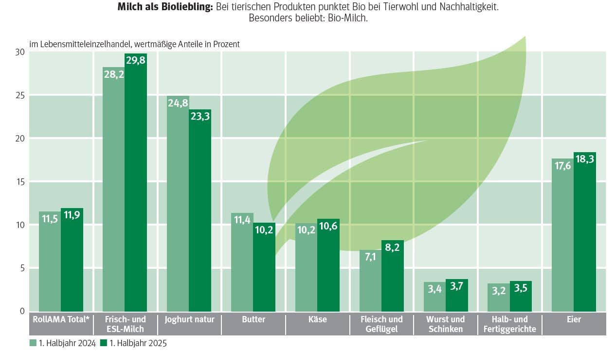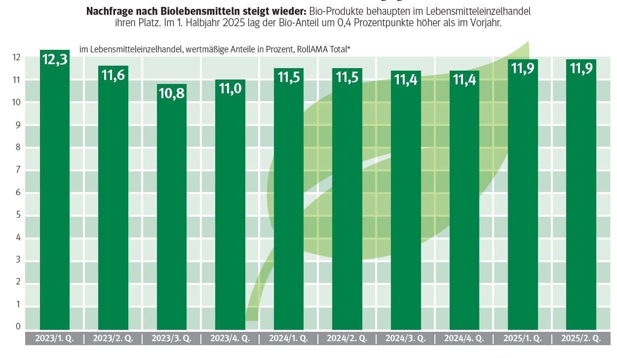 „Wir haben gute Nachrichten über Bio zu berichten“, eröffnete LK Präsident Andreas Steinegger, die Pressekonferenz am 19. November 2025. Nach dem Höhenflug zu Corona Zeiten und einer kleinen Delle danach, ist der Bio-Absatz wieder auf einem guten Niveau angelangt. Bio-Lebensmittel sind im österreichischen Handel gefragt. Der Wert der Bio-Einkäufe legte im ersten Halbjahr 2025 um 8,5 % zu. Besondern gut nachgefragt werden Milchprodukte, Eier, Gemüse und Mehl. „Bei Bio-Rindfleisch übersteigt die Nachfrage das Angebot. Neue Betriebe wären gefragt “, ergänzt Steinegger. Auch der Bio-Ackerbau hat ein gutes Jahr hinter sich. Das gute Wetter und die guten Erträge spielten den Bauern in die Karten. Der wertmäßige Anteil an Bio-Lebensmittel liegt bei knapp 12 % und hat gegenüber 2024 um fast 0,5 % zugelegt. Der Bio-Anteil liegt bei Milch bei etwa 30 %, bei Eiern bei 18 % und bei Käse bei ca. 11 %. „Die steigenden Lebenserhaltungskosten sollten für den Absatz von Bio-Produkten keine Gefahr darstellen“, sagt Thomas Gschier, Obmann von Bio Ernte Steiermark. Vor allem in Deutschland haben österreichische Bio-Produkte einen hervorragenden Ruf.