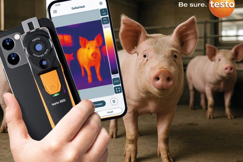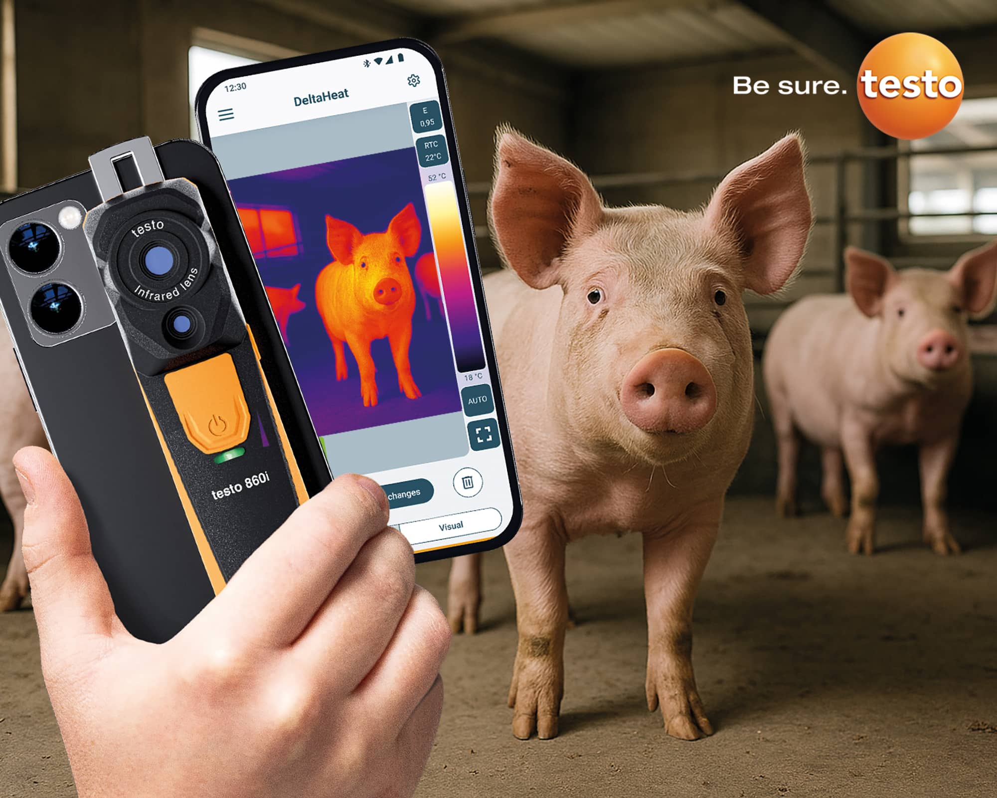 Mit der neuen Wärmebildkamera testo 860i haben Landwirte ein praktisches Werkzeug an der Hand, um Temperaturunterschiede bei Schweinen sofort sichtbar zu machen. Statt jedes Tier einzeln mit herkömmlichen Methoden zu kontrollieren, erlaubt die Thermografie einen schnellen Überblick über den gesamten Stall.