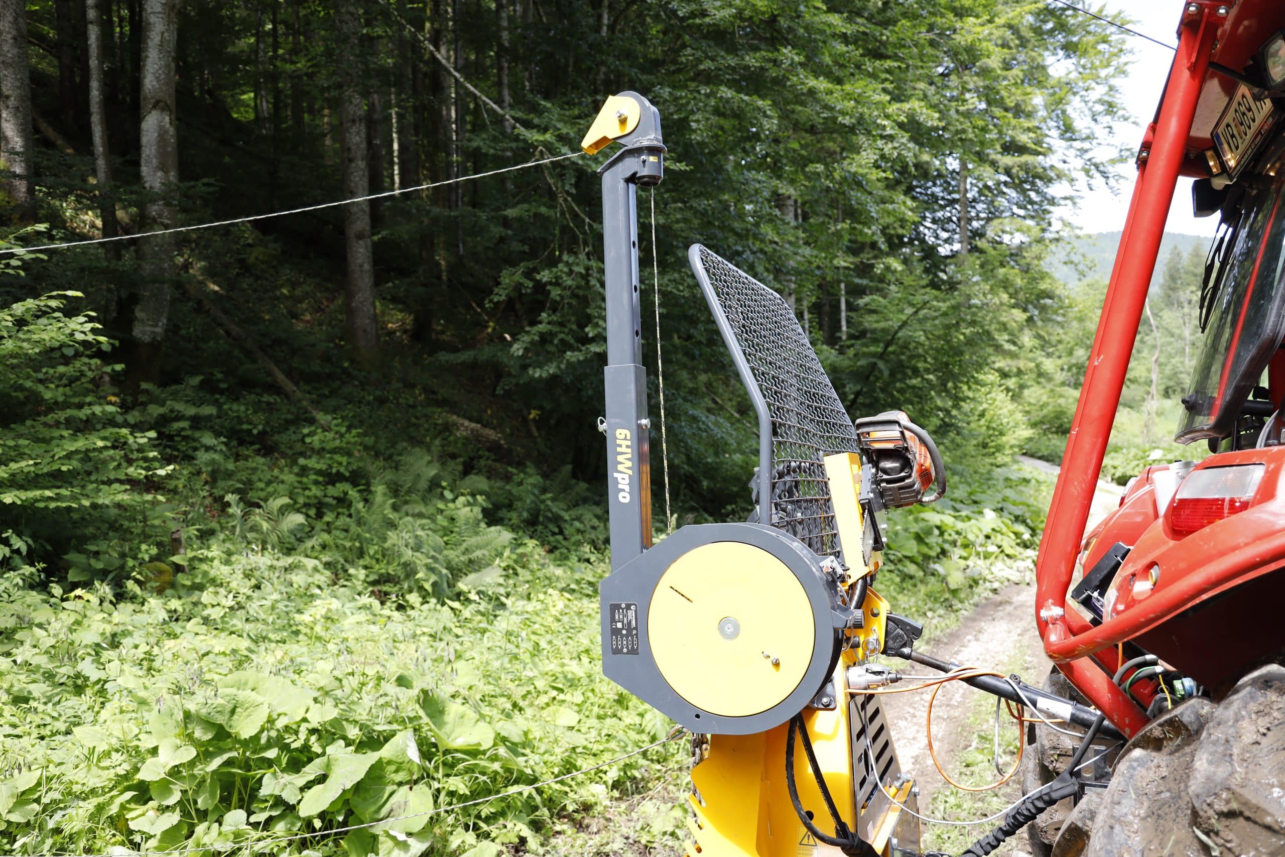 Die Winde ist kompakt und stabil seitlich verbaut, ragt aber am 1,8 m breiten Schild hervor. Alternativ kann man sie mittig über der Oberlenkeraufnahme montieren – dies schränkt allerdings die Sicht leicht ein. Die Höhenverstellung ist sauber ausgeführt. Das Seil läuft in einem höhenverstellbaren Turm, die Seileinlaufrolle ist um 360° drehbar. So lässt sich das Hilfsseil flexibel führen. Die Seiltrommel der 6HWpro selbst ist fest auf der Welle eines Hydraulikmotors montiert. Dieser wird über die Traktorhydraulik angetrieben.